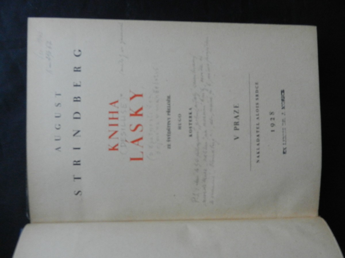 | Digitalizovaná tiráž: | AUGUST STRINDBERG KNIHA LÁSKY VÝBOR Z MODRÉ KNIHY Ze švédštiny přeložil Hugo Kosterka. Obálka od C. Boudy. Vytiskla knihtiskárna F. Obziny ve Vyškově na Mor. ve 2000 výtiscích r. 1928. Kromě toho vydáno 50 číslovaných výtisků na similijapanu |