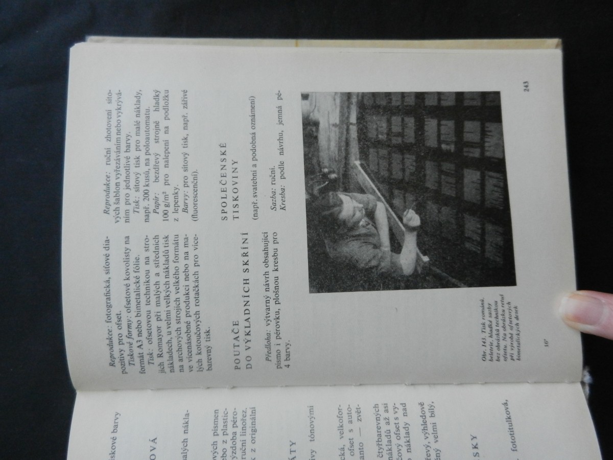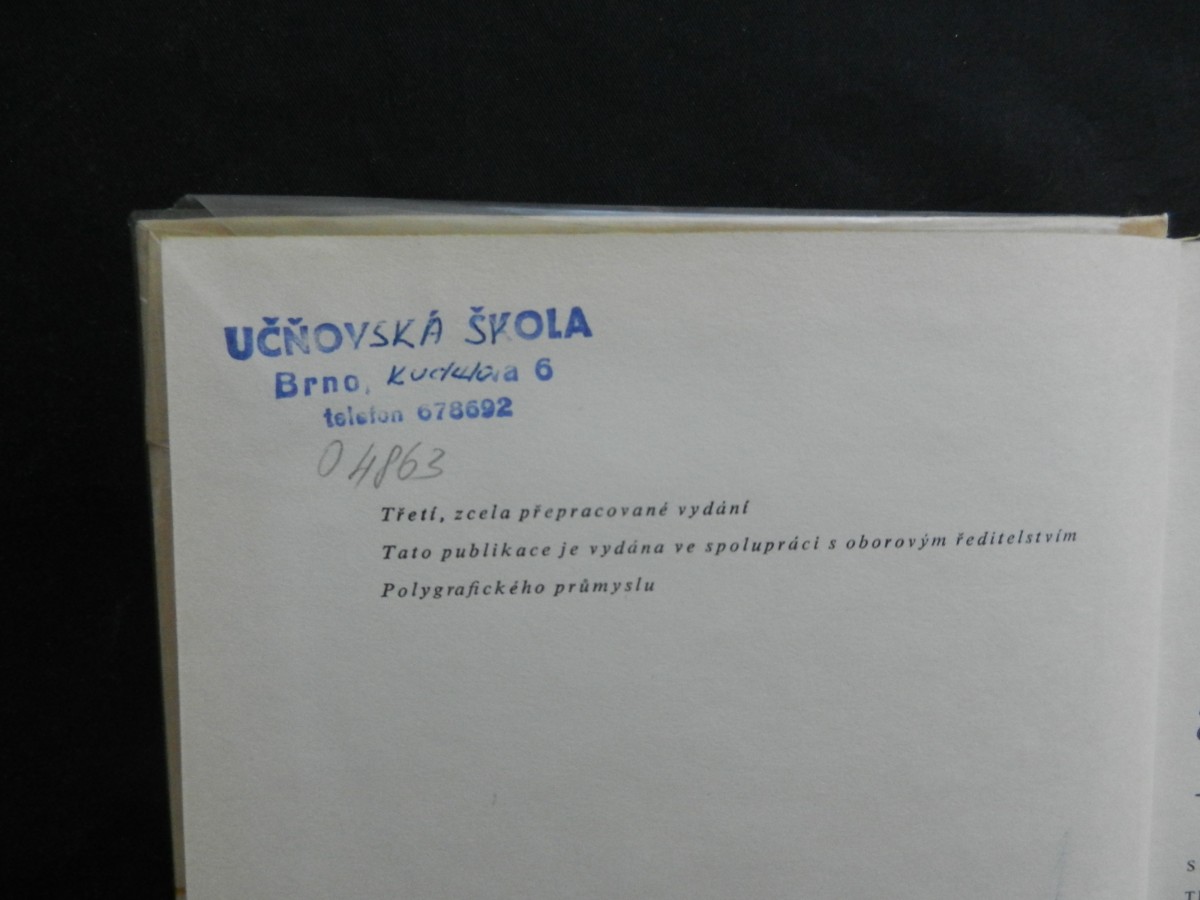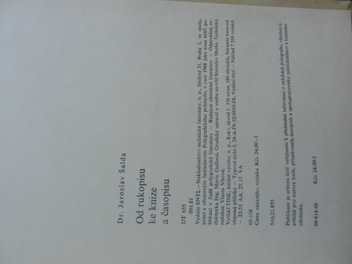 | Digitalizovaná tiráž: | Dr. Jaroslav Šalda Od rukopisu ke knize a časopisu DT 655 001.81 Vydalo SNTL-Nakladatelství technické literatury, n. p., Spálená 51, Praha 1, ve spolu- práci s oborovým ředitelstvím Polygrafického průmyslu, v roce 1968 jako svou 6187. pu- blikaci v řadě polygrafické literatury Redakce chemické literatury Odpovědná re- daktorka Ing. Marie Gallová, Graficky upravil a vazbu navrhl Stanislav Maršo. Technická redakce Vlasta Vitová. - - Vytisk! TISK, knižní výroba, n. p., Brn), závod 1. 336 stran, 189 obrázků, 4stranná barevná vlepená příloha - Typové čislo L 24-A-IV-32/6692-IX. Vydání třetí Náklad 7 200 výtisků - 23,53 AA, 25,15 VA 05-158 Cena vázaného výtisku Kčs 24,00-I 510,21,855 Publikace je určena širši veřejnosti k přehledné informaci o otázkách polygrafie; vhodná je zvláště pro autory knih, přispěvatele časopisů a spolupracovníky nakladatelství a knižního obchodu. 04-614-68 Kčs 24,00-1 |