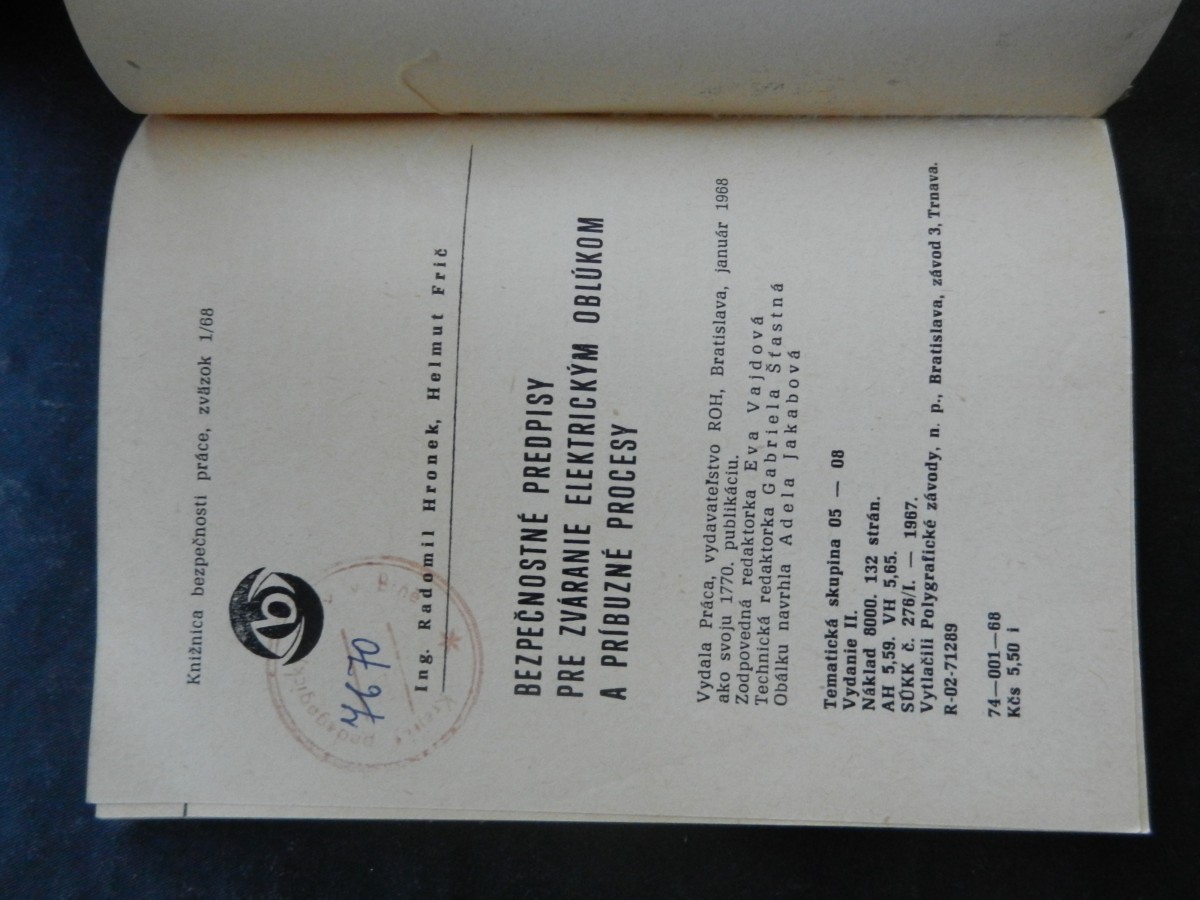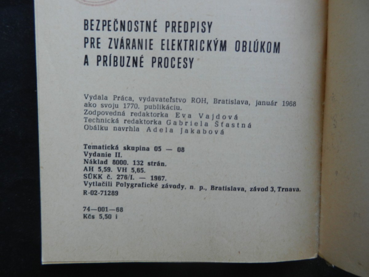 | Digitalizovaná tiráž: | Knižnica bezpečnosti práce, zväzok 1/68 b gogick 4670 Ing. Radomil Hronek, Helmut Frič BEZPEČNOSTNÉ PREDPISY PRE ZVÁRANIE ELEKTRICKÝM OBLÚKOM A PRÍBUZNÉ PROCESY Vydala Práca, vydavateľstvo ROH, Bratislava, január 1968 ako svoju 1770. publikáciu. Zodpovedná redaktorka Eva Vajdová Technická redaktorka Gabriela Stastná Obálku navrhla Adela Jakabová Tematická skupina 05 - 08 Vydanie II. Náklad 8000. 132 strán. AH 5,59. VH 5,65. SÜKK č. 276/I. - 1967. Vytlačili Polygrafické závody, n. p., Bratislava, závod 3, Trnava. R-02-71289 74-001-68 Kčs 5,50 i |