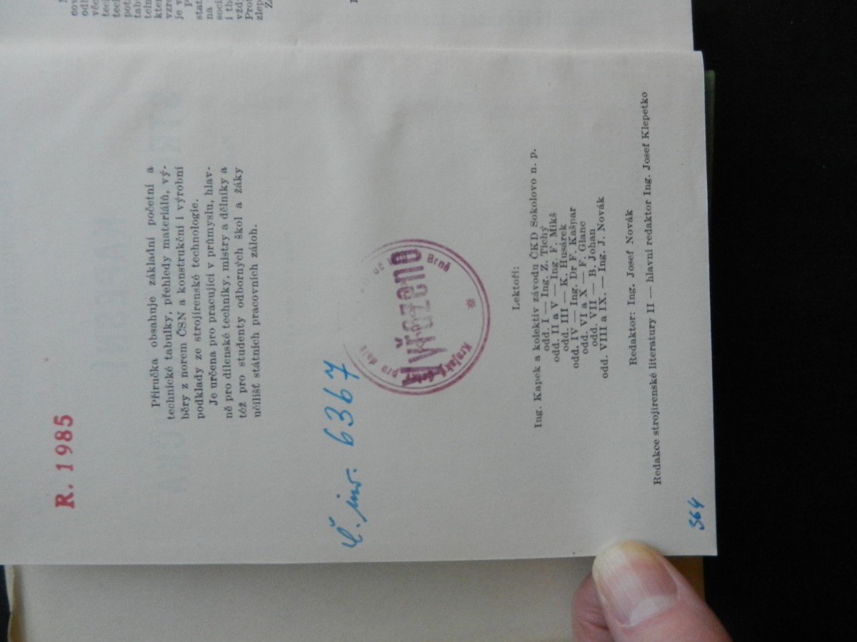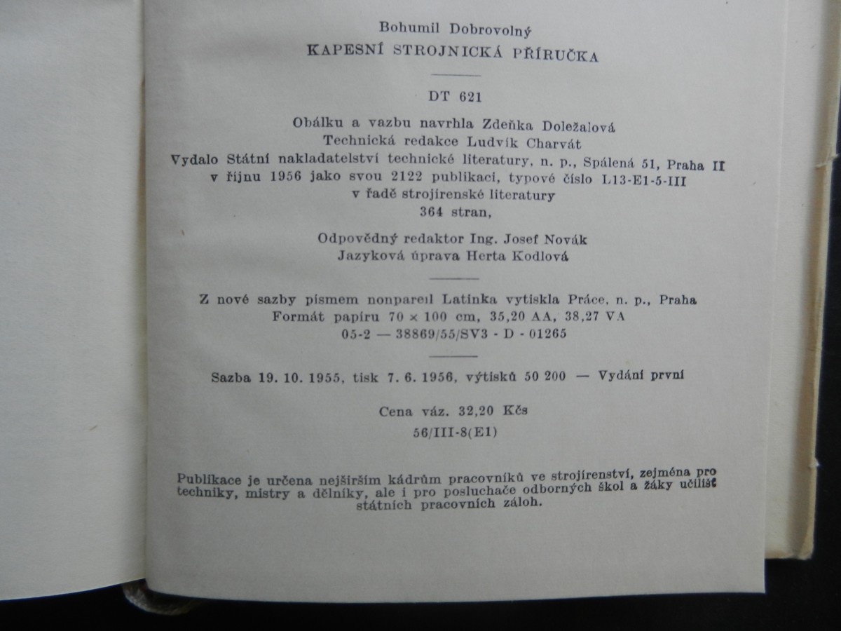 | Digitalizovaná tiráž: | Bohumil Dobrovolný KAPESNÍ STROJNICKÁ PŘÍRUČKA DT 621 Obálku a vazbu navrhla Zdeňka Doležalová Technická redakce Ludvík Charvát Vydalo Státní nakladatelství technické literatury, n. p., Spálená 51, Praha II v říjnu 1956 jako svou 2122 publikaci, typové číslo L13-E1-5-III v řadě strojírenské literatury 364 stran, Odpovědný redaktor Ing. Josef Novák Jazyková úprava Herta Kodlová Z nové sazby písmem nonpareil Latinka vytiskla Práce, n. p., Praha Formát papíru 70 x 100 cm, 35,20 AA, 38,27 VA 05-238869/55/SV3 D-01265 Sazba 19. 10. 1955, tisk 7. 6. 1956, výtisků 50 200 Vydání první Cena váz. 32,20 Kčs 56/III-8(E1) Publikace je určena nejširším kádrům pracovníků ve strojírenství, zejména pro techniky, mistry a dělníky, ale i pro posluchače odborných škol a žáky učilišt státních pracovních záloh. |