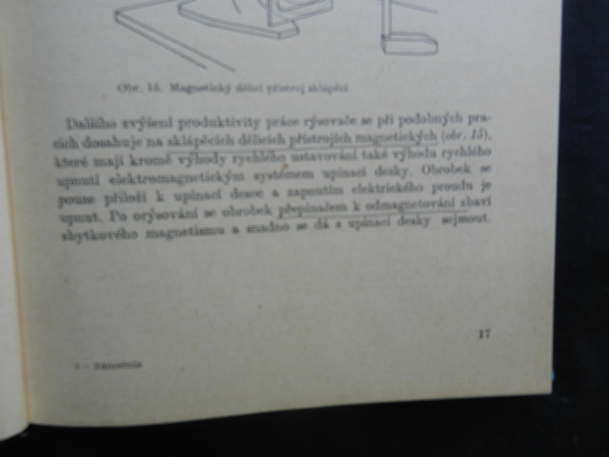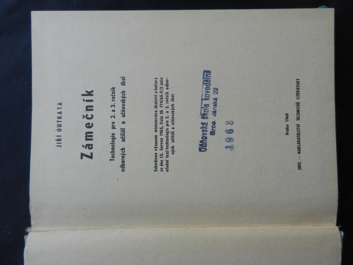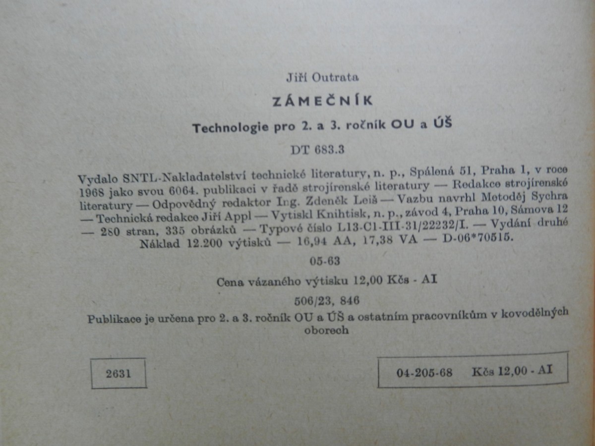 | Digitalizovaná tiráž: | Jiří Outrata ZÁMEČNÍK Technologie pro 2. a 3. ročník OU a Úš DT 683.3 Vydalo SNTL-Nakladatelství technické literatury, n. p., Spálená 51, Praha 1, v roce Redakce strojírenské 1968 jako svou 6064. publikaci v řadě strojírenské literatury. Vazbu navrhl Metoděj Sychra literatury. Odpovědný redaktor Ing. Zdeněk Leiš - Technická redakce Jiří Appl-Vytiskl Knihtisk, n. p., závod 4, Praha 10, Sámova 12 280 stran, 335 obrázků Typové číslo L13-C1-III-31/22232/I. - - Vydání druhé Náklad 12.200 výtisků 16,94 AA, 17,38 VAD-06*70515. 05-63 Cena vázaného výtisku 12,00 Kčs - AI 506/23, 846 Publikace je určena pro 2. a 3. ročník OU a US a ostatním pracovníkům v kovodělných oborech 2631 04-205-68 Kes 12,00-AI |