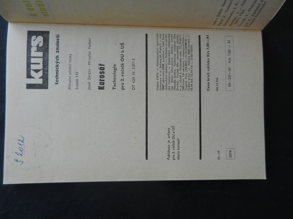 | Digitalizovaná tiráž: | § 2012 kurs technických znalostí Příruční učební texty Svazek 143 Josef Zerzán Miroslav Feskov Karosář Technologie pro 2. ročník OU a UŠ DT 629.11 3.011.5 Publikace je určena pro 2. ročník OU a Uš oboru karosář Vydalo SNTL - Nakladatelství technické literatury, n. p., Spálená 51, Praha 1, v roce 1967 jako svou 5998. publikaci v řadě Kurs technických znalostí Redakce strojíren- ské literatury Odpovědná redaktorka Ing. Alena Charvátová. Obálku navrhl Metoděj Sychra. Technický redaktor Ota Dvořák. Vytiskl Mir, novinářské závody, n. p., závod 1, Václavské nám. 15, Praha 1. 160 stran, 141 obrázků, 1 vlepená příloha- Typové číslo L13-B1C-IV-31/22198/XI Vydání první Náklad 3000 výtisků 10,44 AA, 10,74 VA-D-06*70374 05-59 2574 100 Cena brož. výtisku Kčs 7,00-AI 506/23,826 04-237-67 Kčs 7,00 - Al Lanz a Žáček: Stav Kejval, Z.: Technol Dolmatovskij, J. A.: SNTL 1960 Havliček, V.-Oste Cermák, V.: Přehled Dite, K.: Základní p Casopis Automobil |