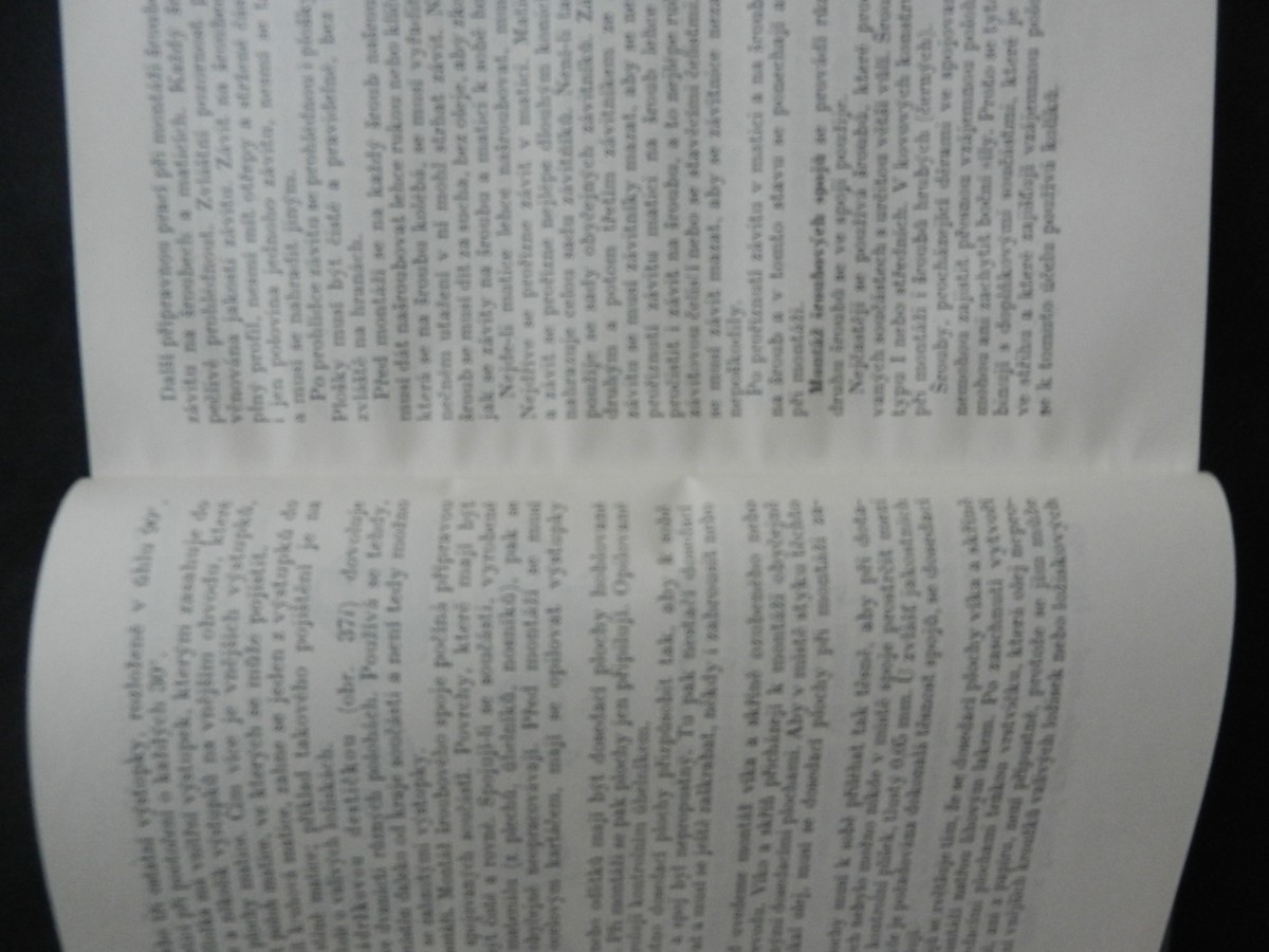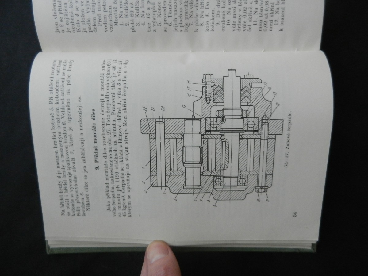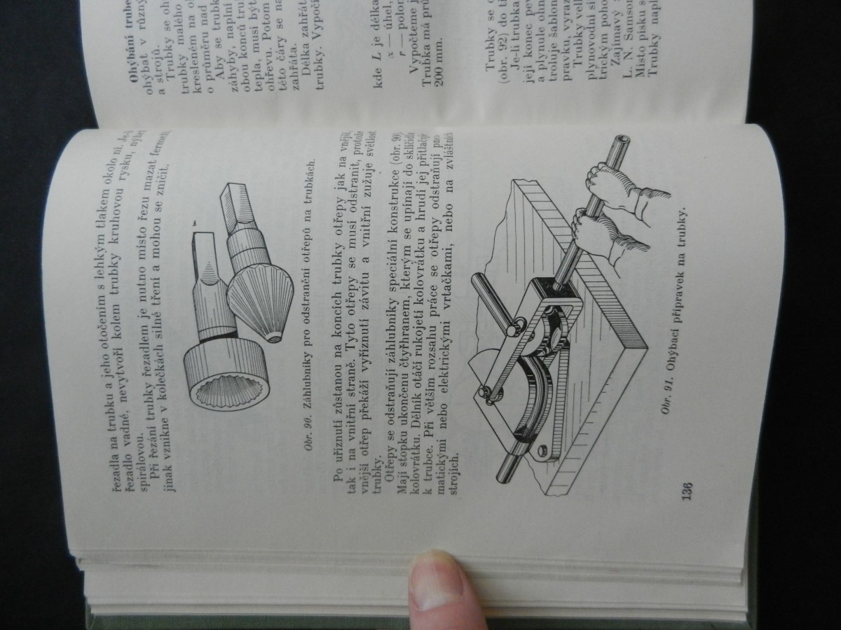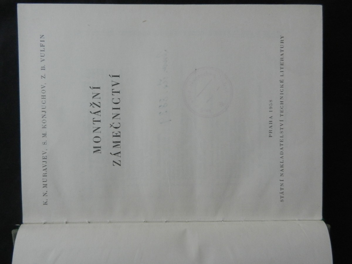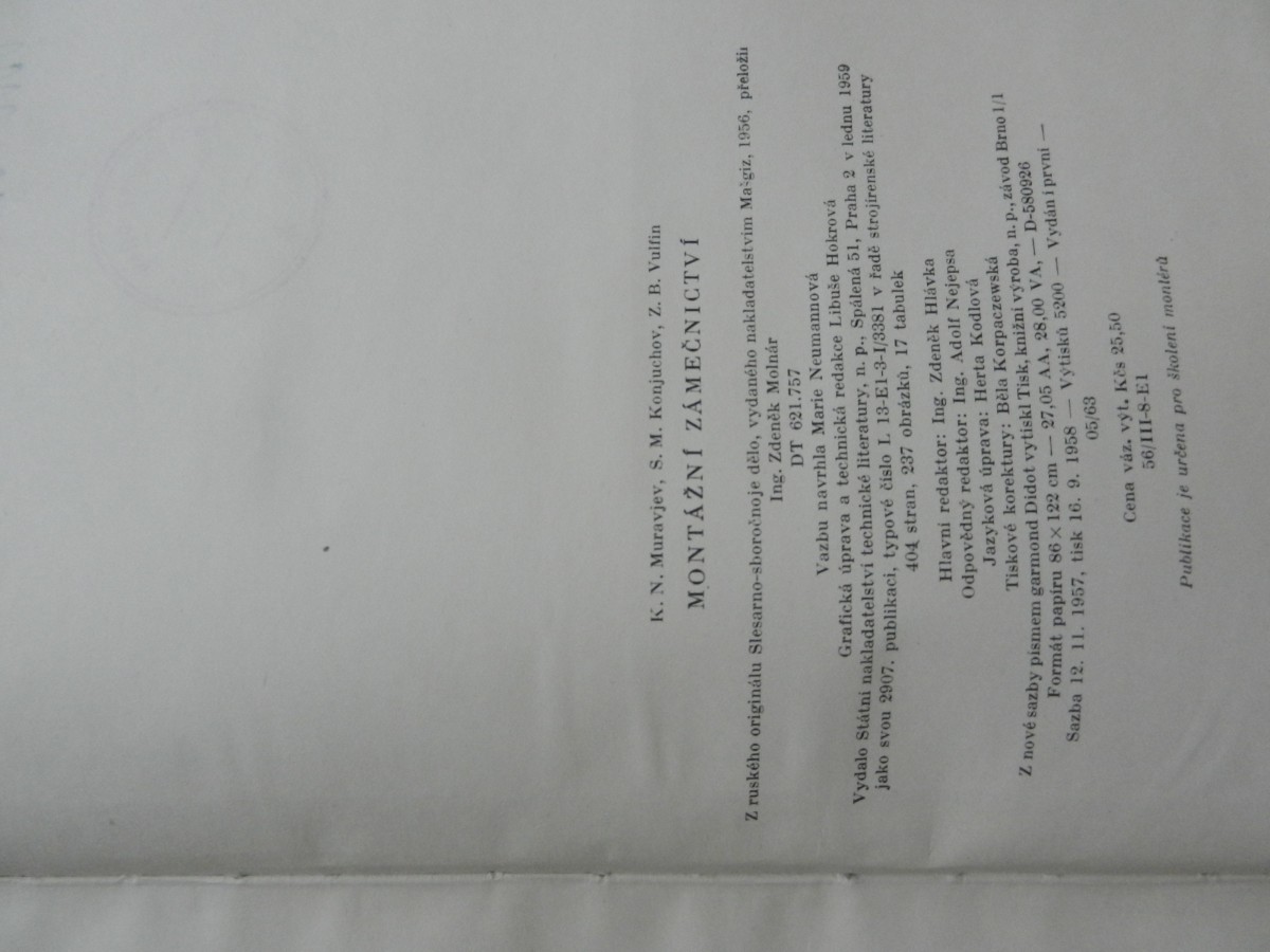 | Digitalizovaná tiráž: | K. N. Muravjev, S. M. Konjuchov, Z. B. Vulfin MONTÁŽNÍ ZÁMEČNICTVÍ Z ruského originálu Slesarno-sboročnoje dělo, vydaného nakladatelstvim Ma-giz, 1956, přeloži Ing. Zdeněk Molnár DT 621.757 Vazbu navrhla Marie Neumannová Grafická úprava a technická redakce Libuše Hokrová Vydalo Státní nakladatelství technické literatury, n. p., Spálená 51, Praha 2 v lednu 1959 jako svou 2907. publikaci, typové číslo L. 13-E1-3-1/3381 v řadě strojírenské literatury 404 stran, 237 obrázků, 17 tabulek Hlavní redaktor: Ing. Zdeněk Hlávka Odpovědný redaktor: Ing. Adolf Nejepsa Jazyková úprava: Herta Kodlová Tiskové korektury: Běla Korpaczewská Z nové sazby pismem garmond Didot vytiskl Tisk, knižní výroba, n. p., závod Brno 1/1 Formát papíru 86 × 122 cm 27,05 AA, 28,00 VA,- D-580926 Sazba 12. 11. 1957, tisk 16. 9. 1958-Výtisků 5200-Vydání první - 05/63 Cena váz, výt. Kes 25,50 56/111-8-E1 Publikace je určena pro školení montérů |