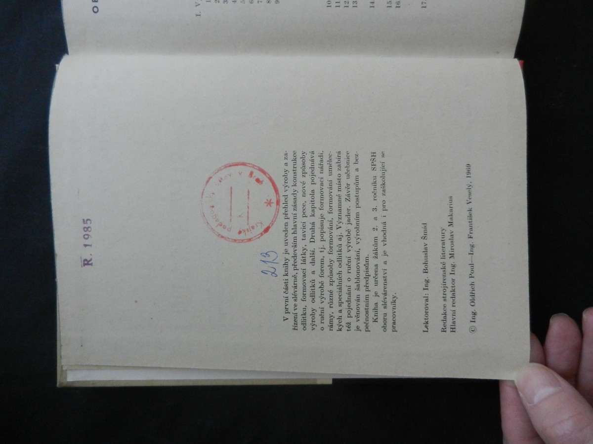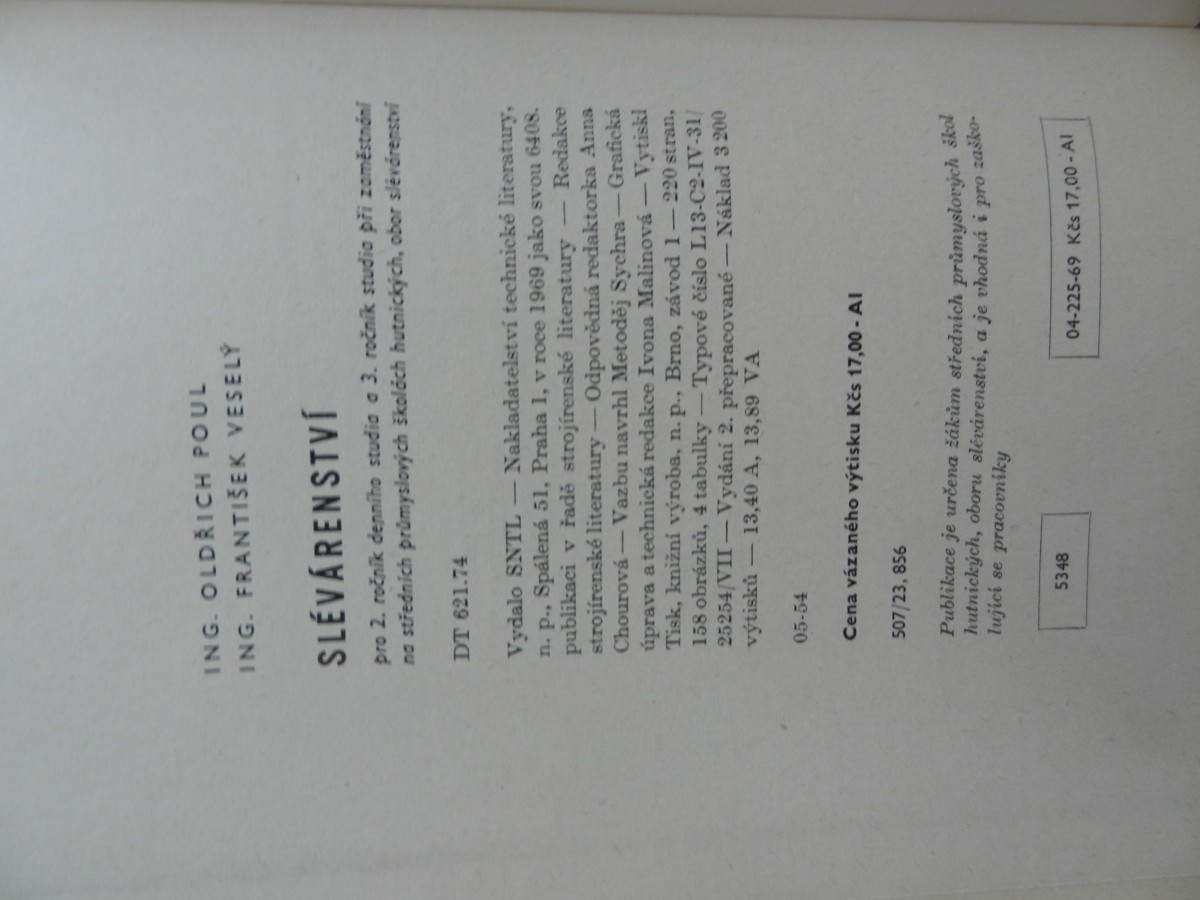 | Digitalizovaná tiráž: | ING. OLDŘICH POUL ING. FRANTIŠEK VESELÝ SLÉVÁRENSTVÍ pro 2. ročník denního studia a 3. ročník studia při zaměstnání na středních průmyslových školách hutnických, obor slévárenství DT 621.74 Vydalo SNTL - Nakladatelství technické literatury, n. p., Spálená 51, Praha 1, v roce 1969 jako svou 6408. publikaci v řadě strojírenské literatury - Redakce strojírenské literatury- Odpovědná redaktorka Anna Chourová - Vazbu navrhl Metoděj Sychra-Grafická úprava a technická redakce Ivona Malinová Vytiskl Tisk, knižní výroba, n. p., Brno, závod 1-220 stran, 158 obrázků, 4 tabulky - Typové číslo L13-C2-IV-31/ 25254/VII-Vydání 2. přepracované - Náklad 3 200 výtisků -13,40 A, 13,89 VA 05-54 Cena vázaného výtisku Kčs 17,00 - AI 507/23,856 - Publikace je určena žákům středních průmyslových škol hutnických, oboru slévárenství, a je vhodná i pro zaško- lující se pracovníky 5348 04-225-69 Kčs 17,00 - Al |