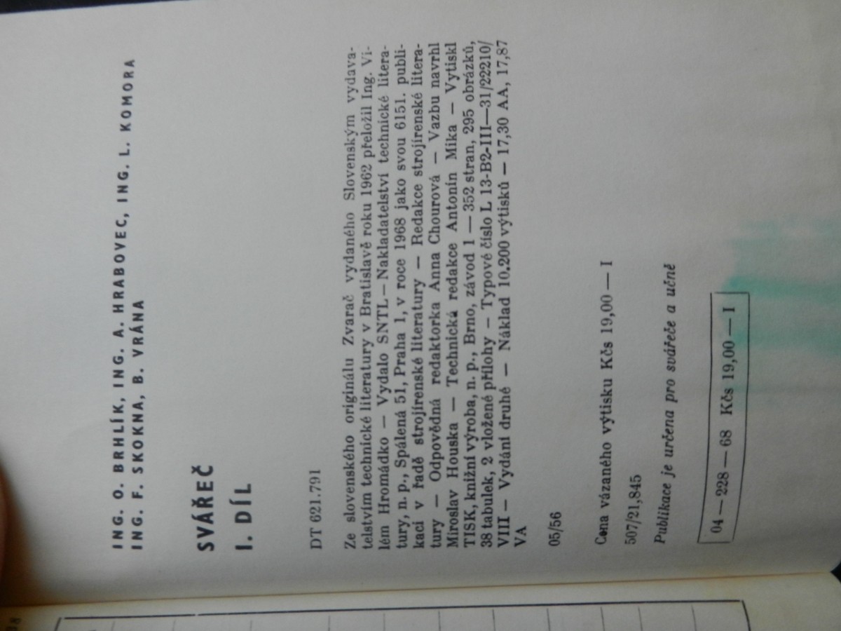 | Digitalizovaná tiráž: | ING. O. BRHLÍK, ING. A. HRABOVEC, ING. L. KOMORA ING. F. SKOKNA, B. VRÁNA SVÁŘEČ 1. DÍL DT 621.791 - Ze slovenského originálu Zvarač vydaného Slovenským vydava- telstvím technické literatury v Bratislavě roku 1962 přeložil Ing. Vi- lém Hromádko - Vydalo SNTL- Nakladatelství technické litera- tury, n. p., Spálená 51, Praha 1, v roce 1968 jako svou 6151. publi- kaci v řadě strojírenské literatury Redakce strojírenské litera- tury Odpovědná redaktorka Anna Chourová - Vazbu navrhl Miroslav Houska - Technická redakce Antonín Mika Vytiskl TISK, knižní výroba, n. p., Brno, závod 1-352 stran, 295 obrázků, 38 tabulek, 2 vložené přílohy - Typové číslo L 13-B2-III-31/22210/ VIII- Vydání druhé Náklad 10.200 výtisků - 17,30 AA, 17,87 VA 05/56 Cena vázaného výtisku Kčs 19,00 - I 507/21,845 Publikace je určena pro svářeče a učně - 04-228-68 Kčs 19,00 -I |