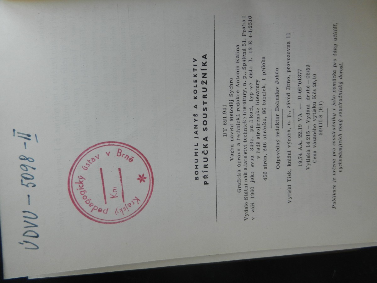 | Digitalizovaná tiráž: | R. 1985 Tato příručka probirá hlavní zásady práce universálního soustružníka. Popi- suje, dává pokyny a návody k práci na soustružnických strojích, pokyny pro úpra- vu nástrojů, pro použití měřidel atd. Je uspořádána tak, aby v jedné knize mohl soustružník při své denní praxi rychle najil vše potřebné a neztrácel čas. Má mu slou- žit k tomu, aby dosáhl vyšší produkti- vity práce při obrábění. Text je doplněn dostatečným počtem obrázků, příkladů a nej- nutnějšími tabulkami. Příručka je určena pro všechny sou- stružniky a poslouží i jako pomůcka pro žáky učilišť vychovávajících nový sou- stružnický dorost. 8800 8800 Inv. čís. 8900 Předmluv I. So A. B. II. Str edagogick Kn stav Rukopis lektoroval František Hummel a Vlastimil Fin Aysle Redakce strojírenské- teratory Brn Hlavni redaktor Ota Kraus B. Janys a kolektiv 1960 A. B. |