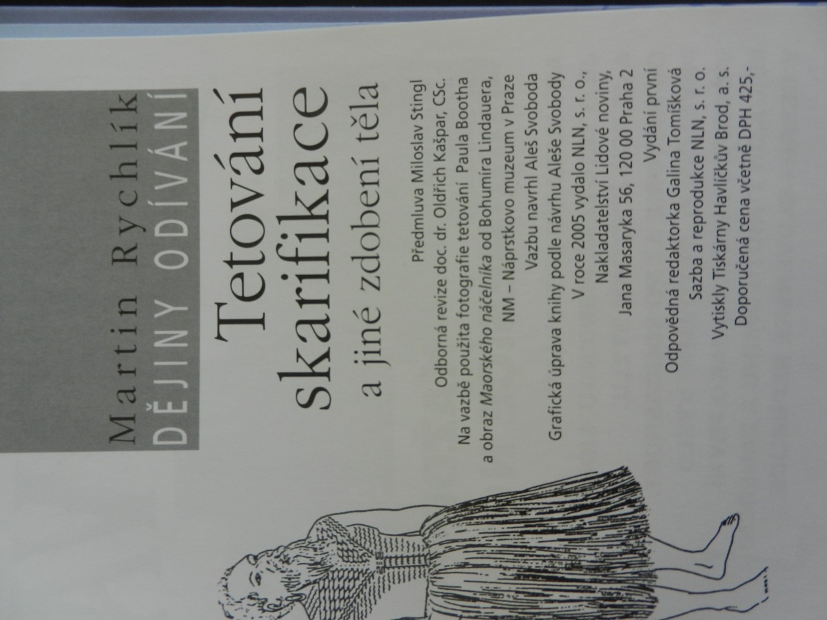 | Digitalizovaná tiráž: | Martin Rychlík DEJINY ODÍVÁNÍ Tetování skarifikace a jiné zdobení těla Předmluva Miloslav Stingl Odborná revize doc. dr. Oldřich Kašpar, CSc. Na vazbě použita fotografie tetování Paula Bootha a obraz Maorského náčelníka od Bohumíra Lindauera, NM - Náprstkovo muzeum v Praze Vazbu navrhl Aleš Svoboda Grafická úprava knihy podle návrhu Aleše Svobody V roce 2005 vydalo NLN, s. r. o., Nakladatelství Lidové noviny, Jana Masaryka 56, 120 00 Praha 2 Vydání první Odpovědná redaktorka Galina Tomišková Sazba a reprodukce NLN, s. r. o. Vytiskly Tiskárny Havlíčkův Brod, a. s. Doporučená cena včetně DPH 425,- |