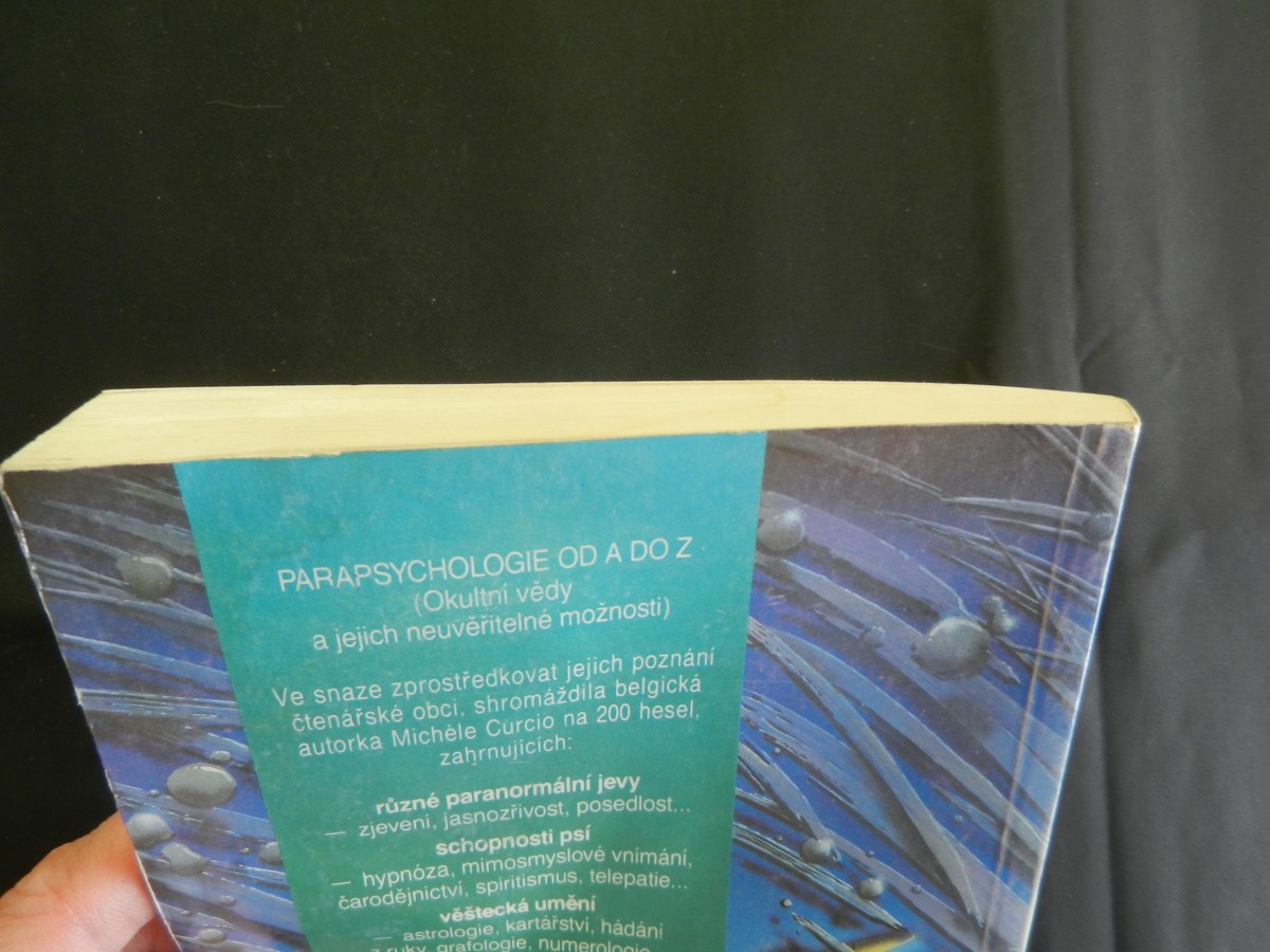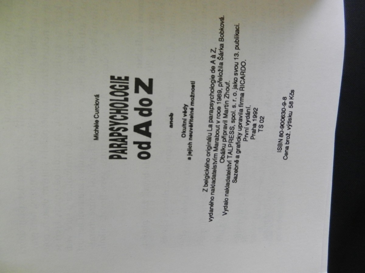| Digitalizovaná tiráž: | Michèle Curciová PARAPSYCHOLOGIE od A do Z aneb Okultní vědy a jejich neuvěřitelné možnosti Z belgického originálu La parapsychologie de A à Z, vydaného nakladatelstvím Marabout v roce 1989, přeložila Šárka Bobková. Obálku připravil Martin Zhouf. Vydalo nakladatelství TALPRESS, spol. s. r. o. jako svou 13. publikaci. Sazebně a graficky upravila firma RICARDO. První vydání. Praha 1992 TS 02 ISBN 80-900630-9-8 Cena brož. výtisku 58 Kčs |