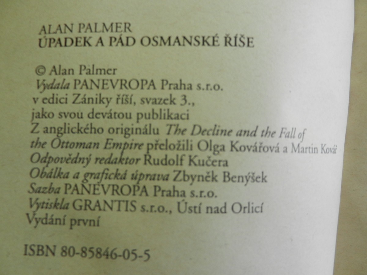 | Digitalizovaná tiráž: | ALAN PALMER ÚPADEK A PÁD OSMANSKÉ ŘÍŠE Alan Palmer Vydala PANEVROPA Praha s.r.o. v edici Zániky říší, svazek 3., jako svou devátou publikaci Z anglického originálu The Decline and the Fall of the Ottoman Empire přeložili Olga Kovářová a Martin Kovář Odpovědný redaktor Rudolf Kučera Obálka a grafická úprava Zbyněk Benýšek Sazba PANEVROPA Praha s.r.o. Vytiskla GRANTIS s.r.o., Ústí nad Orlicí Vydání první ISBN 80-85846-05-5 |