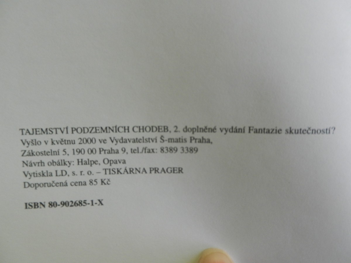 | Digitalizovaná tiráž: | TAJEMSTVÍ PODZEMNÍCH CHODEB, 2. doplněné vydání Fantazie skutečností? Vyšlo v květnu 2000 ve Vydavatelství Š-matis Praha, Zákostelní 5, 190 00 Praha 9, tel./fax: 8389 3389 Návrh obálky: Halpe, Opava Vytiskla LD, s. r. o. - TISKÁRNA PRAGER Doporučená cena 85 Kč ISBN 80-902685-1-X |