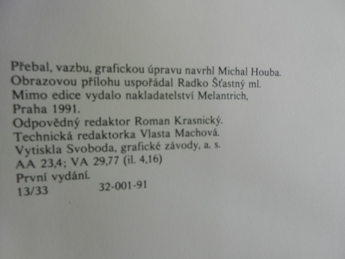 | Digitalizovaná tiráž: | Přebal, vazbu, grafickou úpravu navrhl Michal Houba. Obrazovou přílohu uspořádal Radko Šťastný ml. Mimo edice vydalo nakladatelství Melantrich, Praha 1991. Odpovědný redaktor Roman Krasnický. Technická redaktorka Vlasta Machová. Vytiskla Svoboda, grafické závody, a. s. AA 23,4; VA 29,77 (il. 4,16) První vydání. 13/33 32-001-91 |