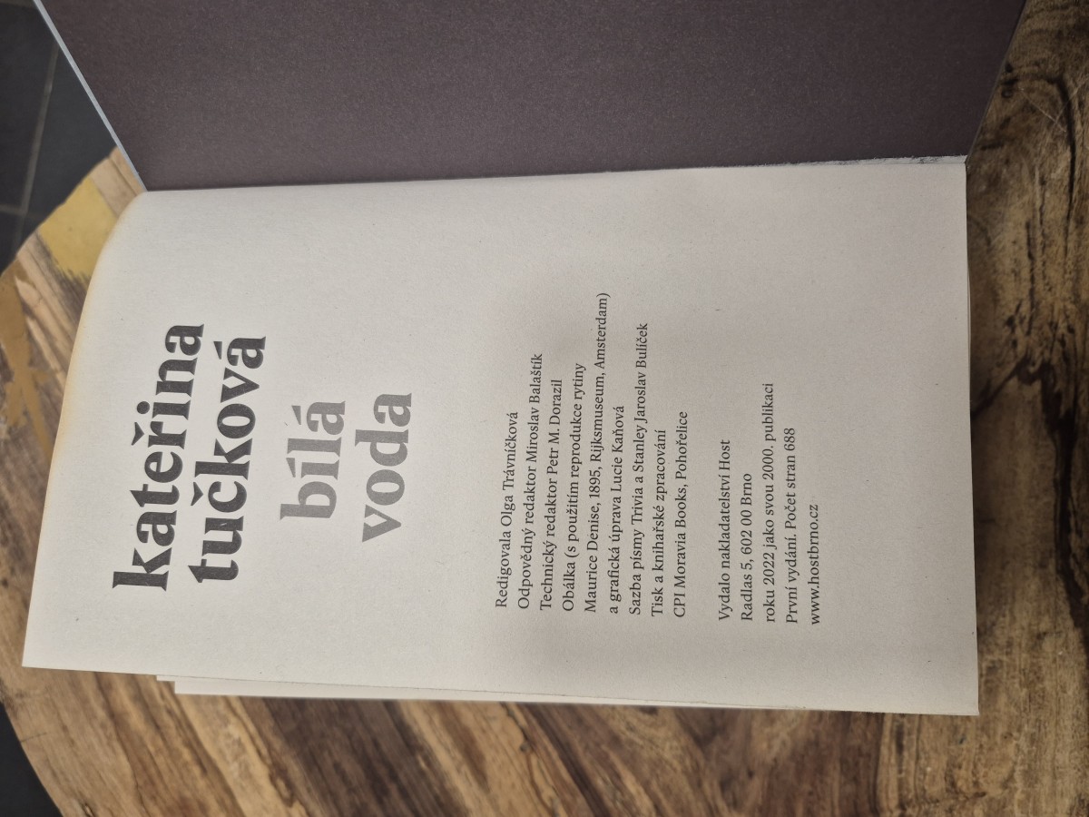| Digitalizovaná tiráž: | kateřina tučková bílá voda Redigovala Olga Trávníčková Odpovědný redaktor Miroslav Balaštík Technický redaktor Petr M. Dorazil Obálka (s použitím reprodukce rytiny Maurice Denise, 1895, Rijksmuseum, Amsterdam) a grafická úprava Lucie Kaňová Sazba písmy Trivia a Stanley Jaroslav Bulíček Tisk a knihařské zpracování CPI Moravia Books, Pohořelice Vydalo nakladatelství Host Radlas 5, 602 00 Brno roku 2022 jako svou 2000. publikaci První vydání. Počet stran 688 www.hostbrno.cz |