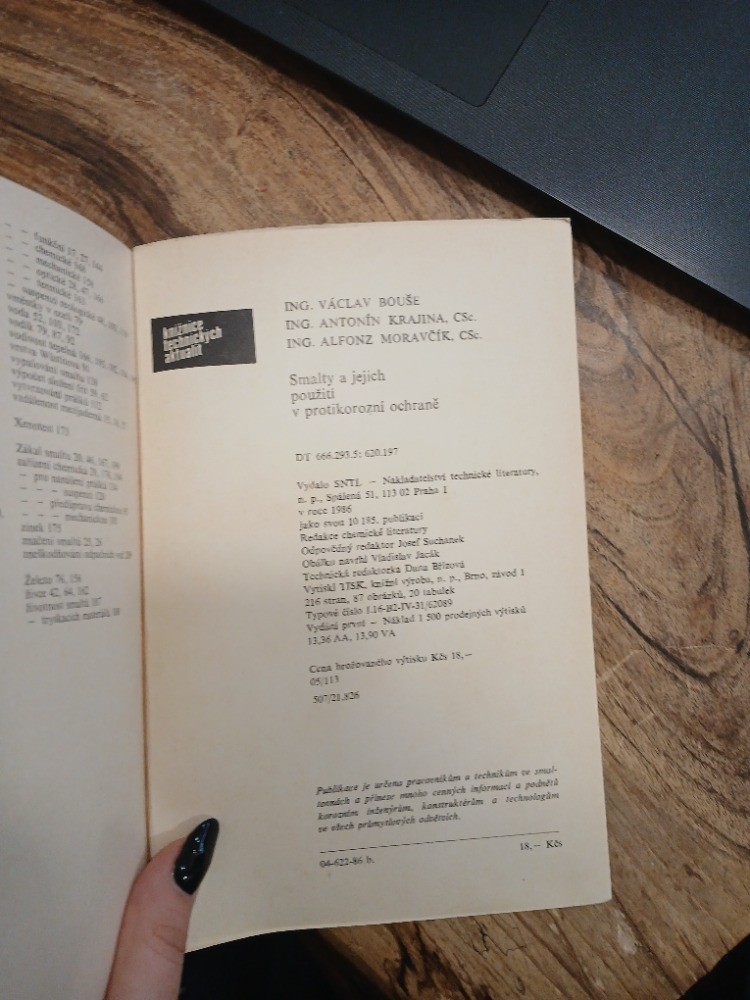 | Digitalizovaná tiráž: | funks 17.11.144 chemacke opic 66 semide Anižnice technickych ING. VÁCLAV BOUŠE ING. ANTONÍN KRAJINA, CSc. ING. ALFONZ MORAVČÍK, CSc. Smalty a jejich použiti v protikorozní ochraně Xmoto 17 Zakal smits 24 fai denda 21. M Zaleto 76,15 Bivax C. SA, XC Exothest small f tryskaci DT 666.293.5: 620.197 Vydalo SNTL-Nakladatelstvi technické literatury, n. p. Spálená 51, 113 02 Praha I v roce 1986 Jako von 10 185. publikaci Redakce chemické literatury Odpovědný redaktor Josef Suchank Obálks navrhl Vladislav Jacák Technicki redaktorka Duna Břizová Vytiskl 175K knižní výroba, n. p., Brno, závod 1 216 stran, 87 obrázku, 20 tabulek Typové čislo 1.16-82-IV-31/62089 Vydini print - Naklad 1 500 prodejných výtisků 13,36 AA, 13,90 VA Cena hrolovaného výtisku Kes 18,- 05/113 507/21.826 Publikace je určena pracovnikim a technikim ve smal tonách a přinese mnoho cenných informaci a podně koroznim intenirim, konstruktérům a technologām se elech primyslových odbereich. 04-622-86 b. 18.- Kes |