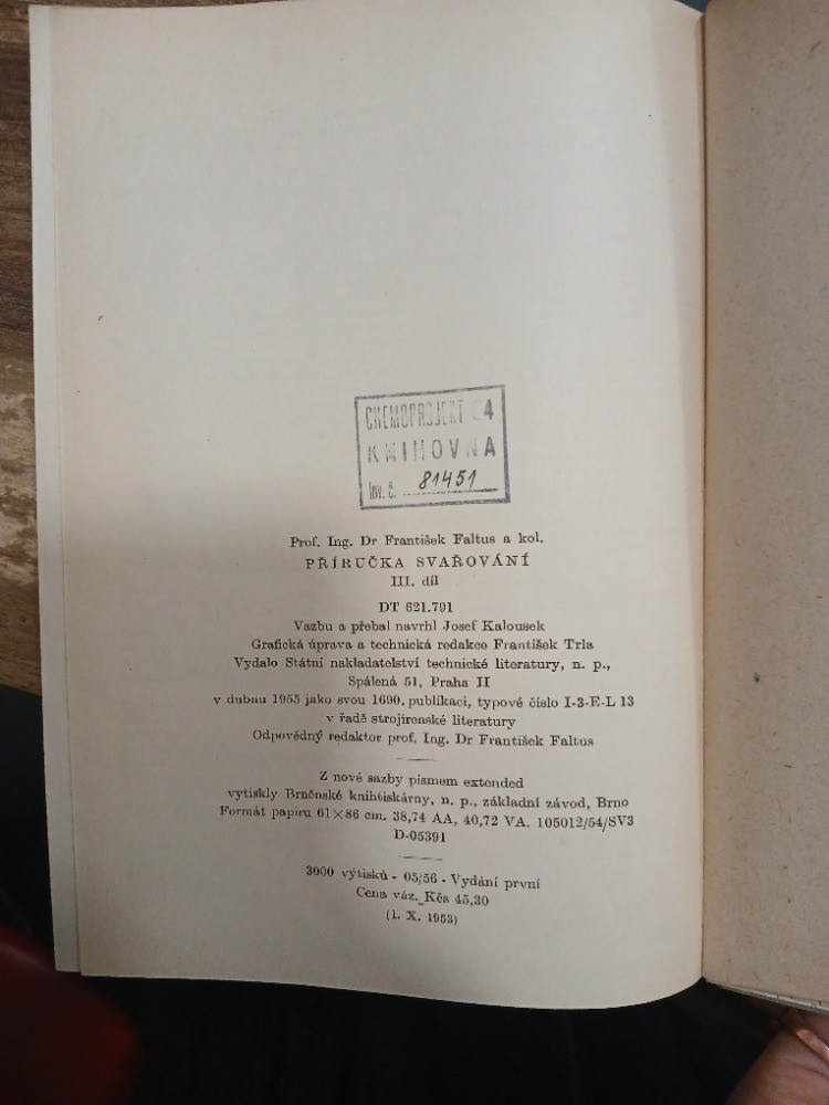 | Digitalizovaná tiráž: | KWINOVA 81451 lev. č. Prof. Ing. Dr František Faltus a kol.. PŘÍRUČKA SVAŘOVÁNÍ III. díl DT 621.791 Vazbu a přebal navrhl Josef Kalousek Grafická úprava a technická redakce František Trla Vydalo Státní nakladatelství technické literatury, n. p., Spálená 51, Praha II v dubnu 1955 jako svou 1690. publikaci, typové číslo I-3-E-L 13 v řadě strojírenské literatury Odpovědný redaktor prof. Ing. Dr František Faltus Z nové sazby písmem extended vytiskly Brněnské knihtiskárny, n. p., základní závod, Brno Formát papiru 61X86 cm. 38,74 AA, 40,72 VA. 105012/54/SV3 D-05391 3000 výtisků 05:56 Vydání první Cena váz. Kes 45,30 (1. X. 1953) |