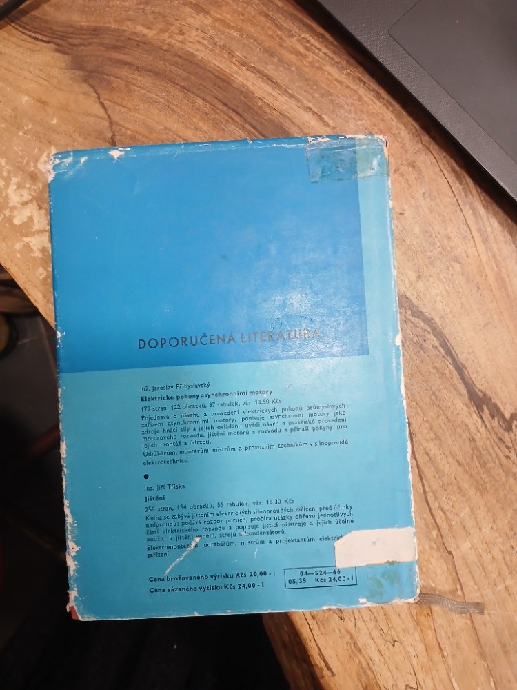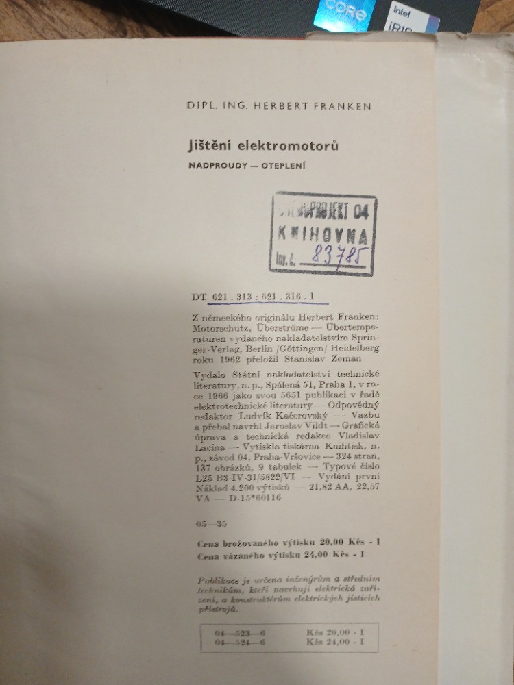 | Digitalizovaná tiráž: | intel CORE IRI DIPL. ING. HERBERT FRANKEN Jištění elektromotorů NADPROUDY OTEPLENÍ - PJEKT 04 KNIHOVNA 83785 DT 621.313: 621.316.1 Z německého originálu Herbert Franken: Motorschutz, Überströme -Übertempe raturen vydaného nakladatelstvím Sprin- ger-Verlag, Berlin /Göttingen/ Heidelberg roku 1962 přeložil Stanislav Zeman Vydalo Státní nakladatelství technické literatury, n. p., Spálená 51, Praha 1, v ro- ce 1966 jako svou 5651 publikaci v řadé elektrotechnické literatury Odpovědný redaktor Ludvík Kačerovský - Vazbu -324 stran, a přebal navrhl Jaroslav Vildt - Grafická úprava a technická redakce Vladislav Lacina Vytiskla tiskárna Knihtisk, n. p., závod 04, Praha-Vršovice 137 obrázků, 9 tabulek L25-B3-IV-31/5822/VI Náklad 4.200 výtisků VA- D-1560116 05-35 - Typové číslo Vydání první 21,82 AA, 22,57 Cena brožovaného výtisku 20,00 Kès -1 Cena vázaného výtiska 24.00 Kès - I Publikace je určena inženýrům a středním technikám, kteří navrhují elektrická zaří. seni, a konstruktérům elektrických jisticich přístrojů. 04-523-6 04-524-6 Kès 20,00 I Kes 24,00-I |