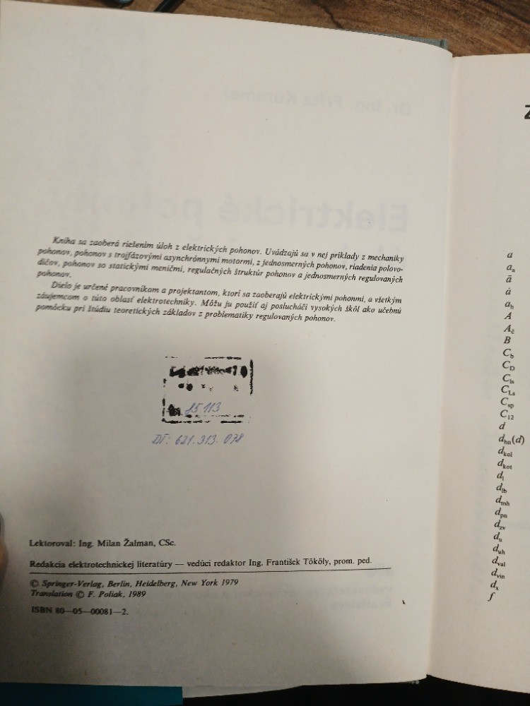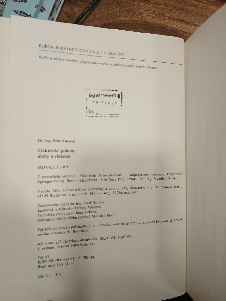 | Digitalizovaná tiráž: | EDÍCIA ELEKTROTECHNICKEJ LITERATÚRY Kniha je určená všetkým záujemcom o návrh a aplikáciu elektrických pohonov. Dr. Ing. Fritz Kümmel Elektrické pohony úlohy a riešenia MDT 621.313.078 Z nemeckého originálu Elektrische Antriebstechnik - Aufgaben und Lösungen, ktorý vydalo Springer-Verlag, Berlin-Heidelberg-New York 1979, preložil Prof. Ing. František Poliak Vydala Alfa, vydavatelstvo technickej a ekonomickej literatúry, n. p., Hurbanovo nám. 3, 815 89 Bratislava, v novembri 1989 ako svoju 11 756. publikáciu Zodpovedný redaktor Ing. Jozef Beniček Jazyková redaktorka Tamara Vargová Technická redaktorka Jana Kubová Ochranný obal a väzbu navrhol Miroslav Floch Vytlačila Slovenská polygrafia. 3. p., Západoslovenské tlačiarne, z. p., závod Svornost, ul. Februá rového víťazstva 20, Bratislava 480 strán, 260 obrázkov, 40 tabulick: 28,21 AH; 28,80 VH 1. vydanie. Náklad 2000 výtlačkov 302 05 ISBN 80-05-00081-2 Kčs 40,- Brož. cena Kés 34,- 508/21: 857 |