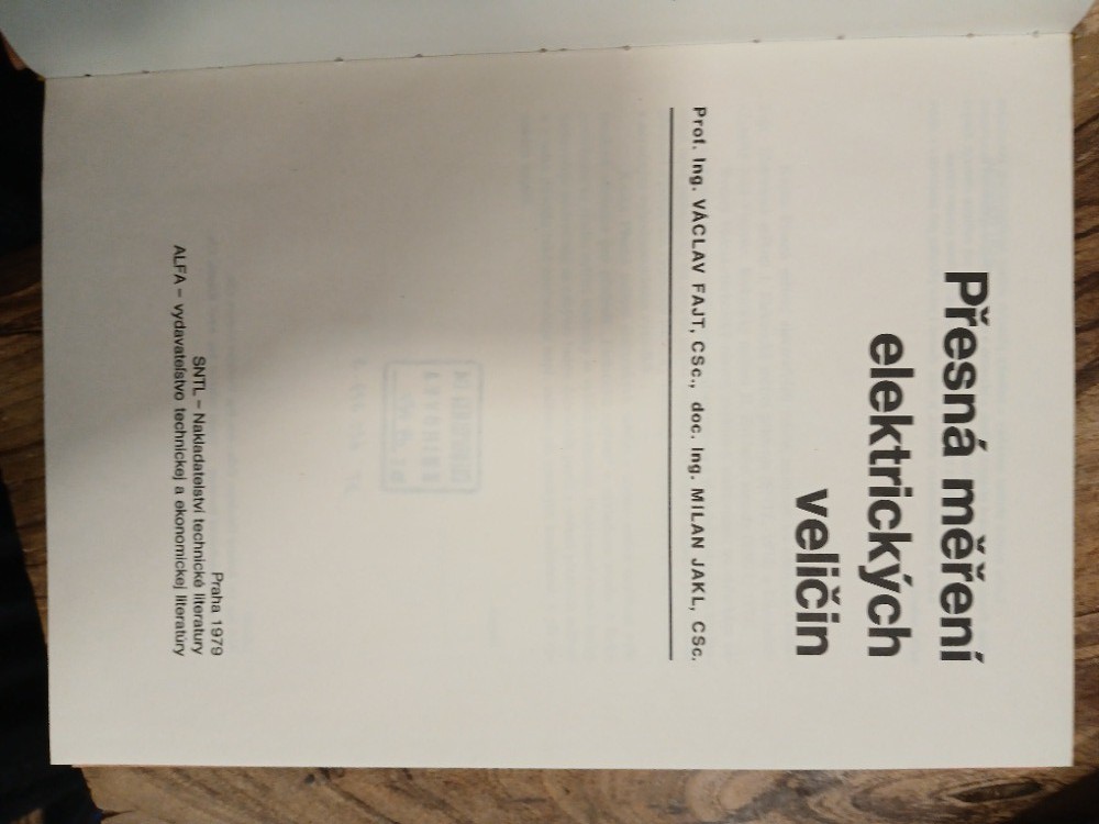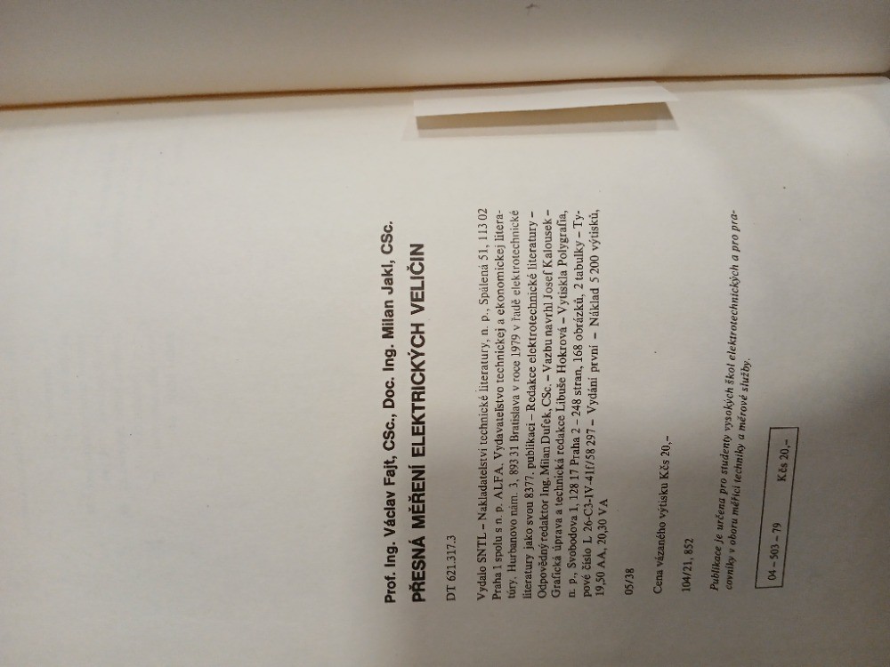 | Digitalizovaná tiráž: | Prof. Ing. Václav Fajt, CSc., Doc. Ing. Milan Jakl, CSc. PŘESNÁ MĚŘENÍ ELEKTRICKÝCH VELIČIN DT 621.317.3 Vydalo SNTL - Nakladatelství technické literatury, n. p., Spálená 51, 113 02 Praha 1 spolu s n. p. ALFA. Vydavatelstvo technickej a ekonomickej litera- túry, Hurbanovo nám. 3, 893 31 Bratislava v roce 1979 v řadě elektrotechnické literatury jako svou 8377. publikaci - Redakce elektrotechnické literatury - Odpovědný redaktor Ing. Milan Dufek, CSc. - Vazbu navrhl Josef Kalousek - Grafická úprava a technická redakce Libuše Hokrová - Vytiskla Polygrafia, n. p., Svobodova 1, 128 17 Praha 2-248 stran, 168 obrázků, 2 tabulky - Ty- pové číslo L 26-C3-1V-41f/58 297 - Vydání první 19,50 AA, 20,30 VA 05/38 Cena vázaného výtisku Kčs 20,- 104/21, 852 - Náklad 5200 výtisků, Publikace je určena pro studenty vysokých škol elektrotechnických a pro pra- covníky v oboru měřicí techniky a měrové služby. 04-503-79 Kčs 20,- |