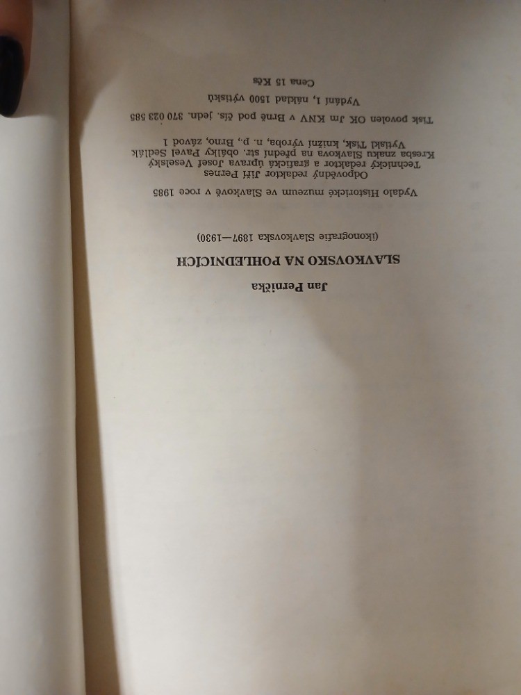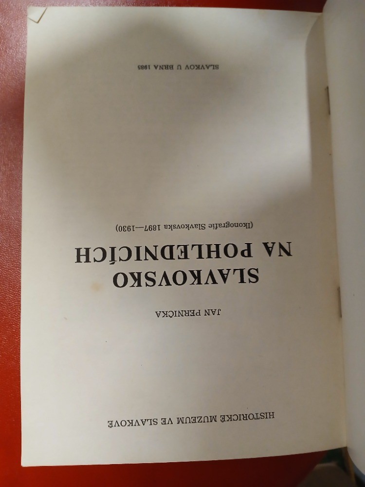 | Digitalizovaná tiráž: | Jan Pernička SLAVKOVSKO NA POHLEDNICICH (ikonografie Slavkovska 1897-1930) Vydalo Historické muzeum ve Slavkově v roce 1985 Odpovědný redaktor Jiří Pernes Technický redaktor a grafická úprava Josef Veselský Kresba znaku Slavkova na přední str. obálky Pavel Sedlák Vytiskl Tisk, knižní výroba, n. p., Brno, závod 1 Tisk povolen OK Jm KNV v Brně pod čís. jedn. 370 023 585 Vydání 1, náklad 1500 výtisků Cena 15 Kčs |