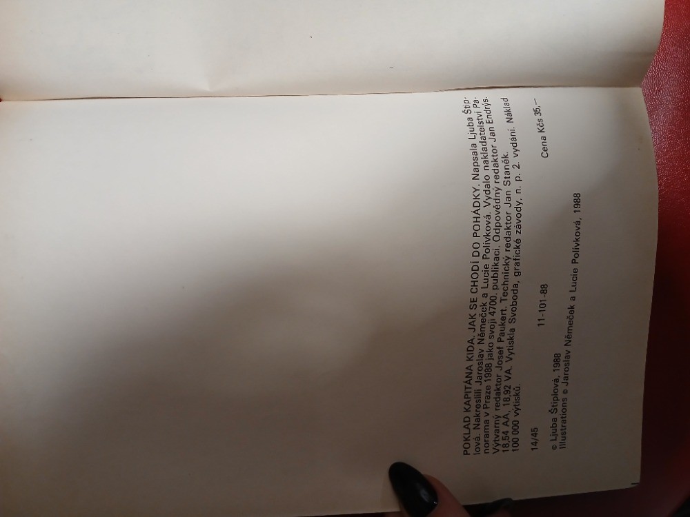 | Digitalizovaná tiráž: | POKLAD KAPITÁNA KIDA. JAK SE CHODÍ DO POHÁDKY. Napsala Ljuba Stip- norama v Praze 1988 jako svoji 4700. publikaci. Odpovědný redaktor Jan Endrys. lová. Nakreslili Jaroslav Němeček a Lucie Polívková. Vydalo nakladatelství Pa- Výtvarný redaktor Josef Paukert. Technický redaktor Jan Staněk. 18,54 AA, 18,92 VA. Vytiskla Svoboda, grafické závody, n. p. 2. vydání. Náklad 100 000 výtisků. 14/45 • Ljuba Štiplová, 1988 11-101-88 Illustrations Jaroslav Němeček a Lucie Polívková, 1988 Cena Kčs 35,- |