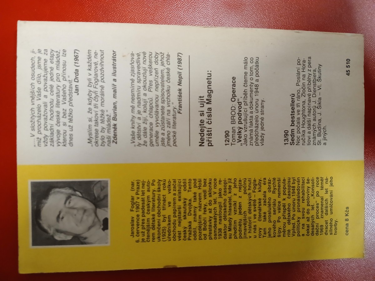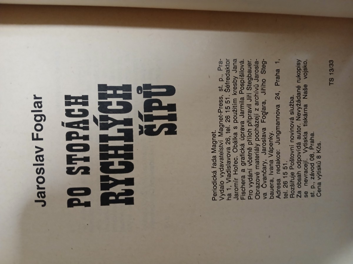 | Digitalizovaná tiráž: | Jaroslav Foglar PO STOPÁCH RYCHLÝCH ŠÍPŮ Periodická řada Magnet. Vydalo vydavatelství Magnet-Press, st. p., Pra- ha 1, Vladislavova 26, tel. 26 15 51. Šéfredaktor Jaromír Hořec. Obálka s použitím kresby Jana Fischera a grafická úprava Jarmila Pospíšilová. Pro vydání včetně příloh připravil Jiří Stegbauer. Obrazové materiály pocházejí z archívů Jarosla- va Čvančary, Jaroslava Foglara, Jiřího Steg- bauera, Ivana Vápenky. Adresa redakce: Jungmannova 24, Praha 1, tel. 26 15 51. Rozšiřuje Poštovní novinová služba. Za obsah odpovídá autor. Nevyžádané rukopisy se nevracejí. Vytiskla tiskárna Naše vojsko, st. p., závod 08, Praha. Cena výtisků 8 Kčs. TS 13/33 |