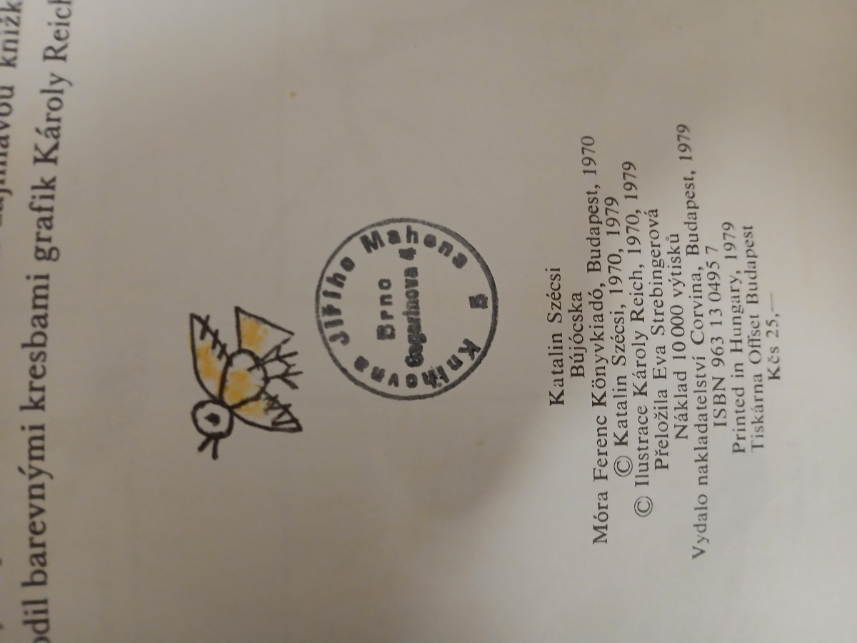 | Digitalizovaná tiráž: | Móra Ferenc Könyvkiadó, Budapest, 1970 Katalin Szécsi, 1970, 1979 Ilustrace Károly Reich, 1970, 1979 Přeložila Eva Strebingerová Náklad 10 000 výtisků Vydalo nakladatelství Corvina, Budapest, 1979 ISBN 963 13 0495 7 Printed in Hungary, 1979 Tiskárna Offset Budapest Kčs 25,- |