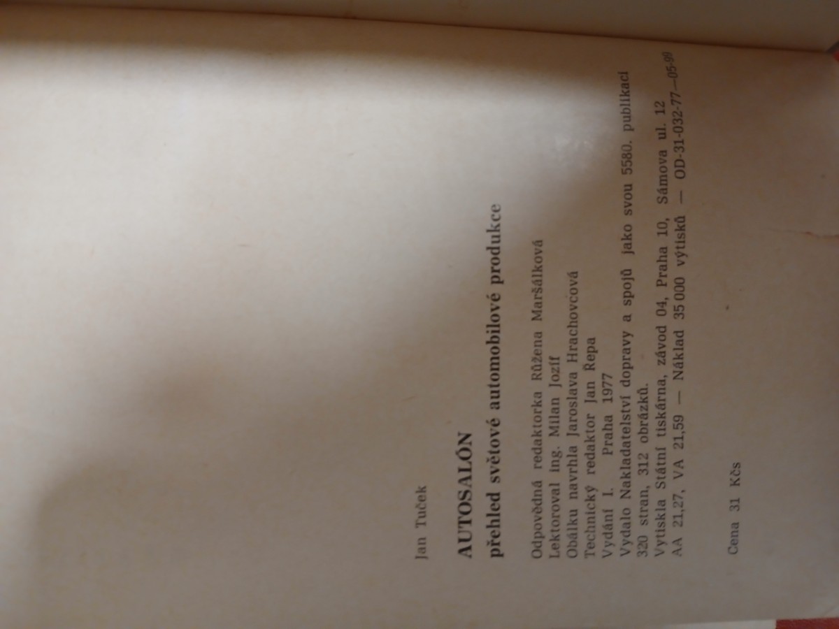 | Digitalizovaná tiráž: | Jan Tuček AUTOSALÓN přehled světové automobilové produkce Odpovědná redaktorka Růžena Maršálková Lektoroval ing. Milan Jozif Obálku navrhla Jaroslava Hrachovcová Technický redaktor Jan Repa Vydání I. Praha 1977 Vydalo Nakladatelství dopravy a spojů jako svou 5580. publikaci 320 stran, 312 obrázků. Vytiskla Státní tiskárna, závod 04, Praha 10, Sámova ul. 12 AA 21,27, VA 21,59 - Náklad 35 000 výtisků OD-31-032-77-05-99 Cena 31 Kès |
