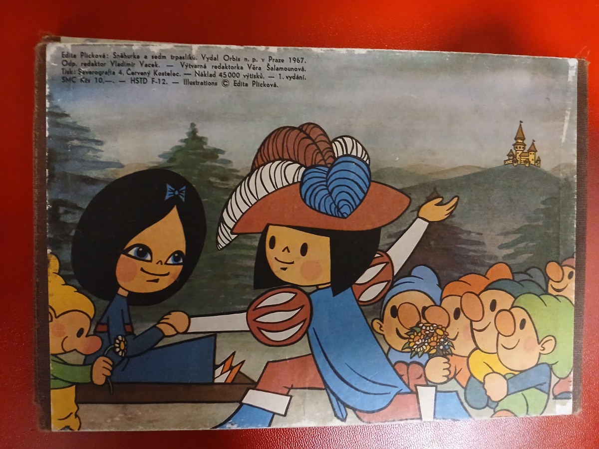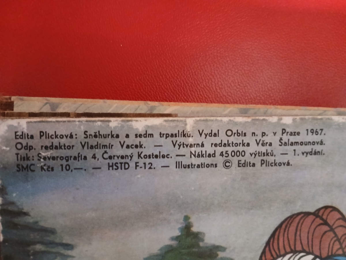 | Digitalizovaná tiráž: | Edita Plicková: Sněhurka a sedm trpaslíků. Vydal Orbis n. p. v Praze 1967. Odp. redaktor Vladimír Vacek. Výtvarná redaktorka Věra Šalamounová. 1. vydání. Tisk: Severografia 4, Červený Kostelec. Náklad 45000 výtisků. SMC Kes 10,-. HSTD F-12. - Illustrations Edita Plicková. - - |