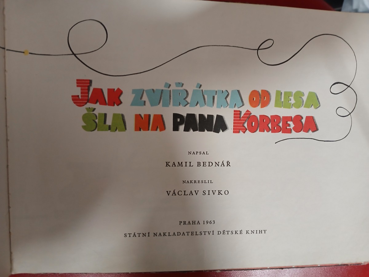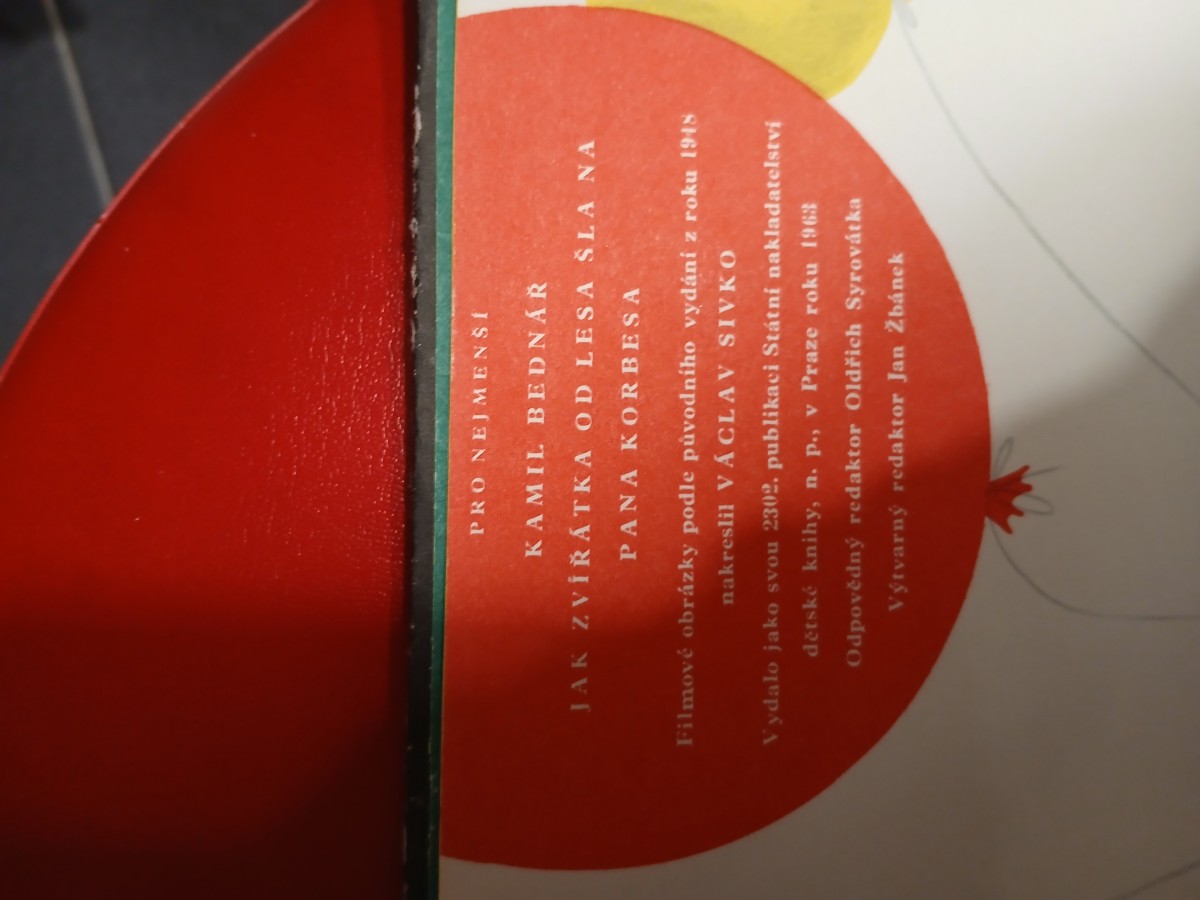 | Digitalizovaná tiráž: | PRO NEJMENŠI KAMIL BEDNÁŘ JAK ZVÍŘÁTKA OD LESA ŠLA NA PANA KORBESA Filmové obrázky podle původního vydání z roku 1948 nakreslil VÁCLAV SIVKO Vydalo jako svou 2302. publikaci Státní nakladatelství dětské knihy, n. p., v Praze roku 1963 Odpovědný redaktor Oldřich Syrovátka Výtvarný redaktor Jan Žbánek |
