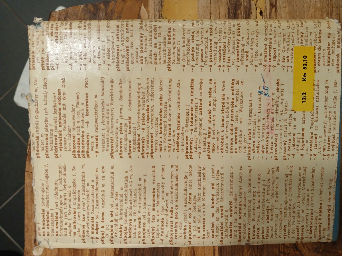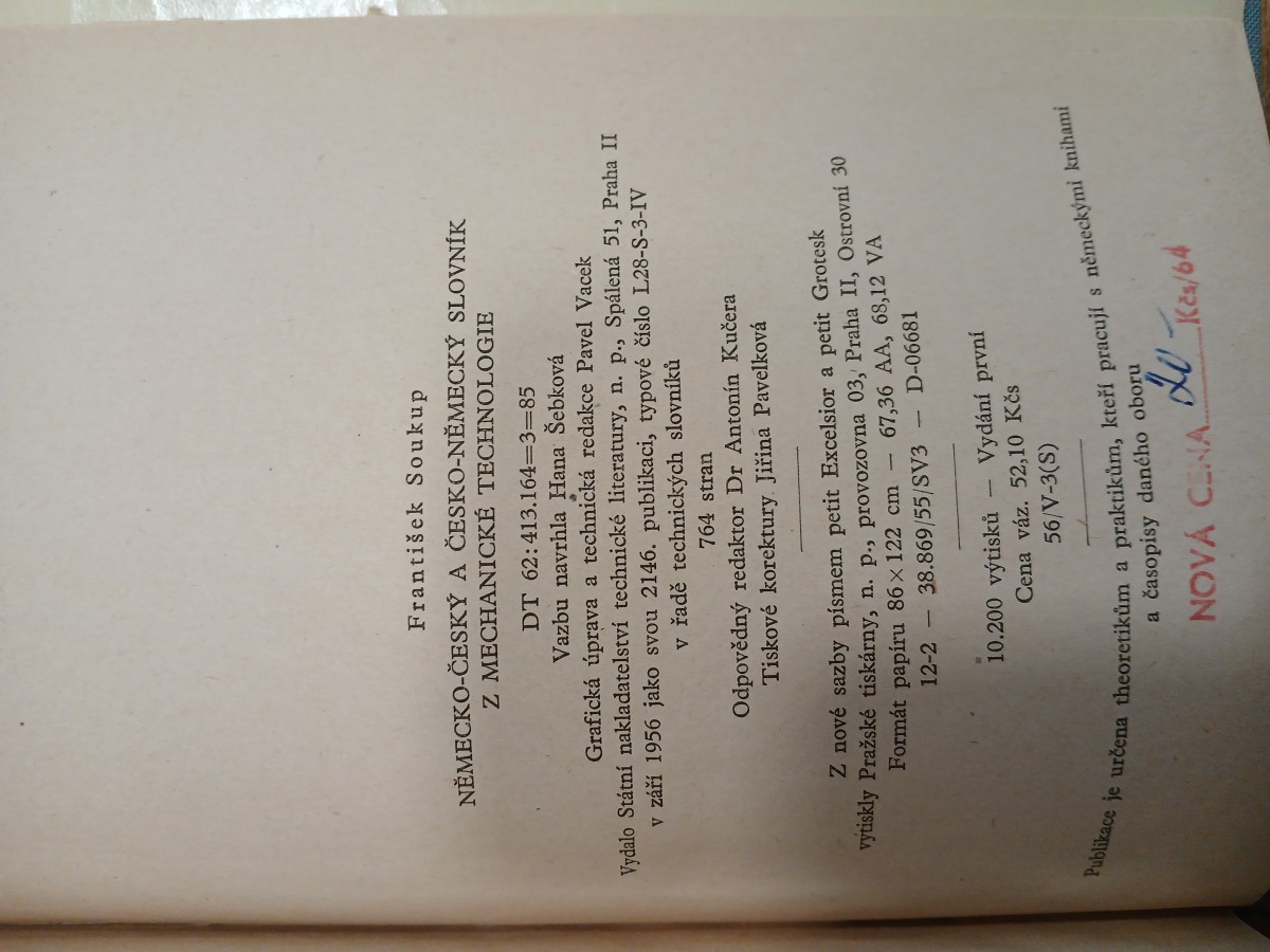 | Digitalizovaná tiráž: | František Soukup NĚMECKO-ČESKÝ A ČESKO-NĚMECKÝ SLOVNÍK Z MECHANICKÉ TECHNOLOGIE DT 62:413.164=3=85 Vazbu navrhla Hana Šebková Grafická úprava a technická redakce Pavel Vacek Vydalo Státní nakladatelství technické literatury, n. p., Spálená 51, Praha II v září 1956 jako svou 2146. publikaci, typové číslo L28-S-3-IV v řadě technických slovníků 764 stran Odpovědný redaktor Dr Antonín Kučera Tiskové korektury Jiřina Pavelková Z nové sazby písmem petit Excelsior a petit Grotesk vytiskly Pražské tiskárny, n. p., provozovna 03, Praha II, Ostrovní 30 Formát papíru 86 × 122 cm - 12-2 38.869/55/SV3 67,36 AA, 68,12 VA - D-06681 10.200 výtisků Vydání první Cena váz. 52,10 Kčs 56/V-3(S) Publikace je určena theoretikům a praktikům, kteří pracují s německými knihami a časopisy daného oboru 20. NOVÁ CENA Kes/64 |