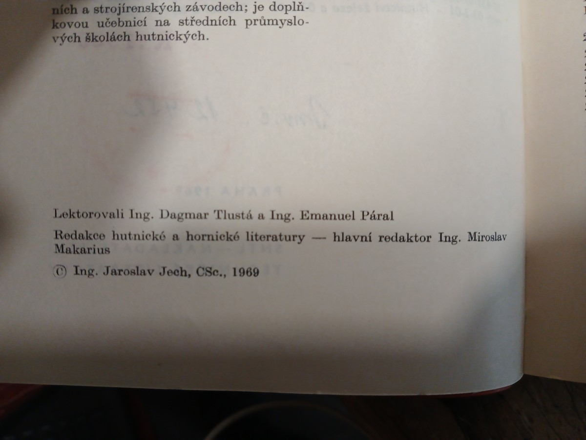 | Digitalizovaná tiráž: | ních a strojírenských závodech; je doplň- kovou učebnicí na středních průmyslo- vých školách hutnických. Lektorovali Ing. Dagmar Tlustá a Ing. Emanuel Páral Redakce hutnické a hornické literatury Makarius Ing. Jaroslav Jech, CSc., 1969 - hlavní redaktor Ing. Miroslav |