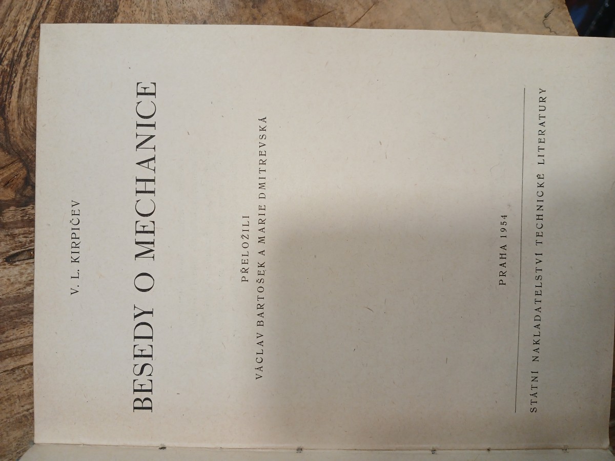 | Digitalizovaná tiráž: | On V. L. Kirpičev BESEDY O MECHANICE Vydání první, vyšlo v říjnu 1954 284 stran, 213 obrázků Vydalo Státní nakladatelství technické literatury, n. p. Spálená 51, Praha II V řadě theoretické literatury DT 531/534 Jazyková úprava: Dr Vlasta Brožová Tiskové korektury: Fr. Zierisová Technická redaktorka: Marie Králová Vazbu navrhl: Zdeněk Šebesta 301 03 5-101 099/3/54/SV3-14484 % Sazba 31. 3. 1954, tisk 17. 9. 1954, 3200 výtisků 8,875 PA, 21,28 AA, 21,98 VA Papír: 222, 61X86, 70 g III-3-A-L 11c D-01597 Vytiskly Brněnské knihtiskárny, n. p., Brno, Gottwaldova 21 ze sazby Cena váz. Kčs 24,70 (1. X. 1953) Nová cena 1.4.1956 Kes |