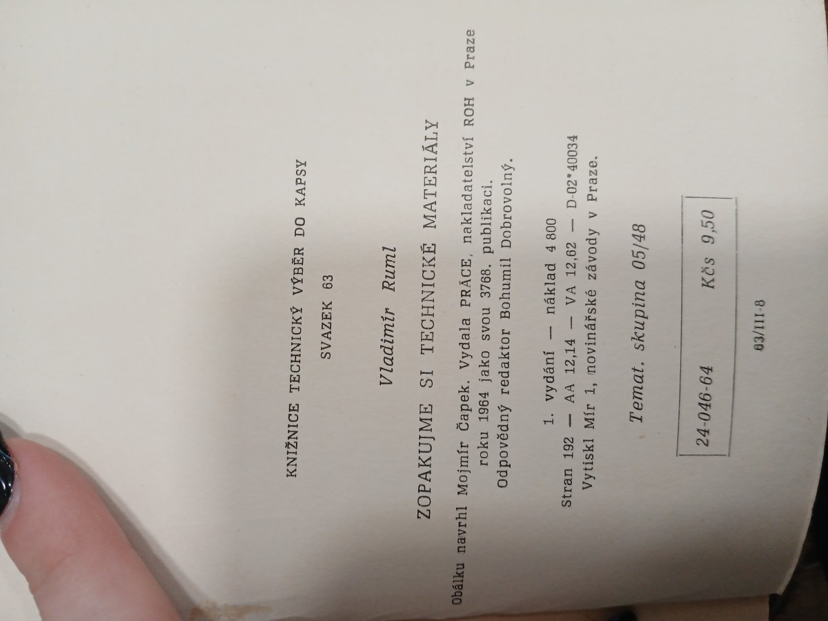 | Digitalizovaná tiráž: | KNIŽNICE TECHNICKÝ VÝBĚR DO KAPSY SVAZEK 63 Vladimir Ruml ZOPAKUJME SI TECHNICKÉ MATERIÁLY Obálku navrhl Mojmír Čapek. Vydala PRÁCE, nakladatelství ROH v Praze roku 1964 jako svou 3768. publikaci. Odpovědný redaktor Bohumil Dobrovolný. 1. vydání - náklad 4 800 Stran 192 - AA 12,14 - VA 12,62 - D-02*40034 Vytiskl Mír 1, novinářské závody v Praze. Temat. skupina 05/48 24-046-64 63/111-8 Kčs 9,50 |