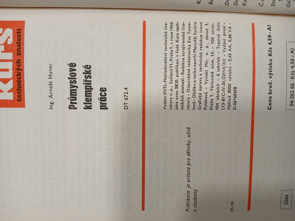 | Digitalizovaná tiráž: | Kurs technických znalosti Ing. Arnošt Huvar Průmyslové klempířské práce DT 672.4 Publikace je určena pro dělníky, učně a studenty 05-59 Vydalo SNTL-Nakladatelství technické lite- ratury n. p., Spálená 51, Praha 1, v roce 1966 jako svou 5800. publikaci v řadě Kurs tech- nických znalostí - Redakce strojírenské lite- ratury - Odpovědná redaktorka Eva Tame- lová - Obálku a vazbu navrhl Metoděj Sychra Grafická úprava a technická redakce Ivona Poláková Vytiskl Mír, n. p., závod 1, Praha 1, Václavské nám. 15. 100 stran, 104 obrázků - 6 tabulek - Typové číslo L13-B1C-IV-31/22114/XII - Vydání první - Náklad 8000 výtisků -5,43 AA, 5,66 VA - D-06*60478 2566 Cena brož. výtisku Kčs 4,50-AI 04-262 66 Kčs 4,50 - Al K Bo DF Do Ko Ča Str S Od |