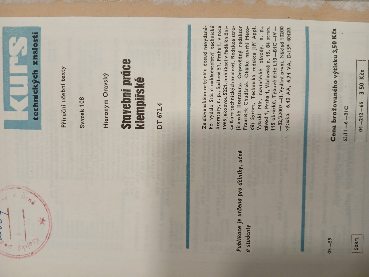 | Digitalizovaná tiráž: | PA Krajský * kurs technických znalostí Příruční učební texty Svazek 108 Hieronym Oravský Stavební práce klempířské DT 672.4 Publikace je určena pro dělníky, učně a studenty Ze slovenského originálu dosud nevydané- ho vydalo Státní nakladatelství technické literatury, n. p., Spálená 51, Praha 1, v roce 1965 jako svou 5221. publikaci v řadě knižni- ce Kurs technických znalostí. Redakce stro- jírenské literatury. Odpovědný redaktor František Chudárek. Obálku navrhl Meto- děj Sychra. Technická redakce Jiří Appl. Vytiskl Mír, novinářské závody, n. P., závod 1, Praha 1, Václavské n. 15. 84 stran, 115 obrázků. Typové číslo L13-B1C-IV- -32/22007-11. Vydání první. Náklad 10200 výtisků. 6,40 AA, 6,74 VA. D-15* 40420. 05-59 508/2 Cena brožovaného výtisku 3,50 Kčs 63/111-6-B1C 04-212-65 3 50 Kčs |