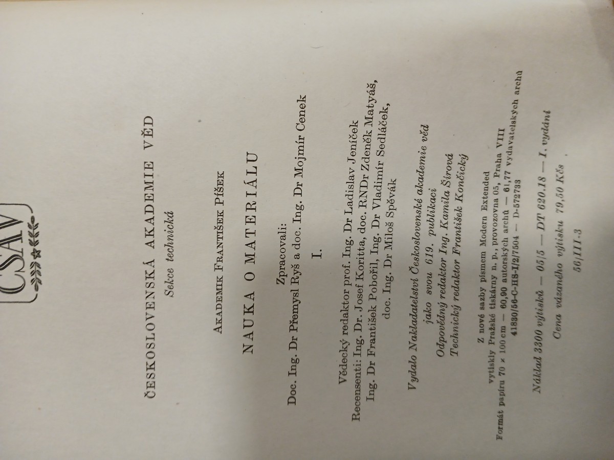 | Digitalizovaná tiráž: | CSAV ČESKOSLOVENSKÁ AKADEMIE VĚD Sekce technická AKADEMIK FRANTIŠEK PÍŠEK NAUKA O MATERIÁLU Zpracovali: Doc. Ing. Dr Přemysl Ryš a doc. Ing. Dr Mojmír Cenek I. Vědecký redaktor prof. Ing. Dr Ladislav Jeníček Recensenti: Ing. Dr. Josef Koritta, doc. RNDr Zdeněk Matyáš, Ing. Dr František Pobořil, Ing. Dr Vladimír Sedláček, doc. Ing. Dr Miloš Spěvák Vydalo Nakladatelství Československé akademie věd jako svou 619. publikaci Odpovědný redaktor Ing. Kamila Šírová Technický redaktor František Končický Z nové sazby písmem Modern Extended vytiskly Pražské tiskárny n. p., provozovna 05, Praha VIII Formát papíru 70 x 100 cm - 60,90 autorských archú - 61,77 vydavatelských archú 41830/56-C-HS-1/2/7504 - D-572738 Náklad 3300 výtisků 05/5 DT 620.18-1. vydání Cena vázaného výtisku 79,50 Kčs 56/111-3 |
