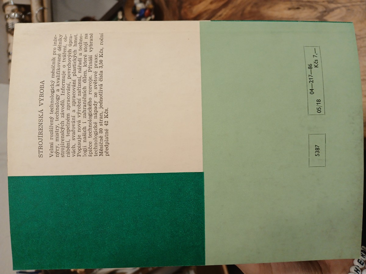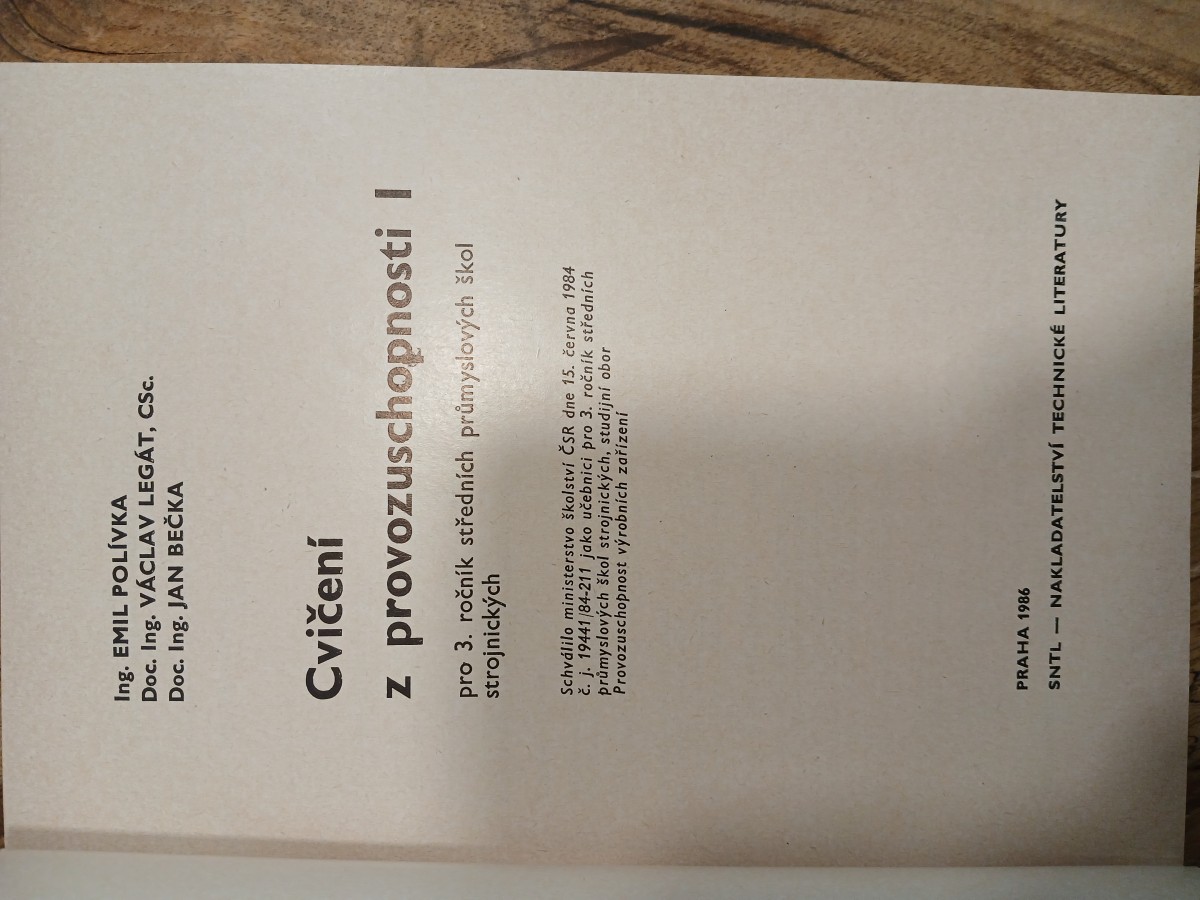| Digitalizovaná tiráž: | Ing. EMIL POLÍVKA Doc. Ing. VÁCLAV LEGÁT, CSc. Doc. Ing. JAN BEČKA Cvičení z provozuschopnosti I pro 3. ročník středních průmyslových škol strojnických DT 621.002.5(076.5)(075.3) Vydalo SNTL - Nakladatelství technické literatury, n. p., Spálená 51, 113 02 Praha 1, v roce 1986 jako svou 10016. publikaci Redakce báňské a strojírenské literatury Odpovědný redaktor Ing. Tomáš Malina Obálku navrhl Metoděj Sychra Technická redakce Eva Endlová Vytiskly Tiskařské závody, n. p., závod 5, Sámova 12, 101 46 Praha 10 112 stran, 37 obrázků, 25 tabulek Typové číslo L13-C2-IV/31/25945. Vydání první Náklad 12 000 prodejných výtisků. 7,11 AA, 7,36 VA 05/18 Cena brožovaného výtisku Kčs 7,- 507/23,826 Publikace je určena studujícím 3. ročníku středních prů myslových škol strojnických, studijního oboru provozu schopnost výrobních zařízení 5387 04-217-86 Kes 7,- |