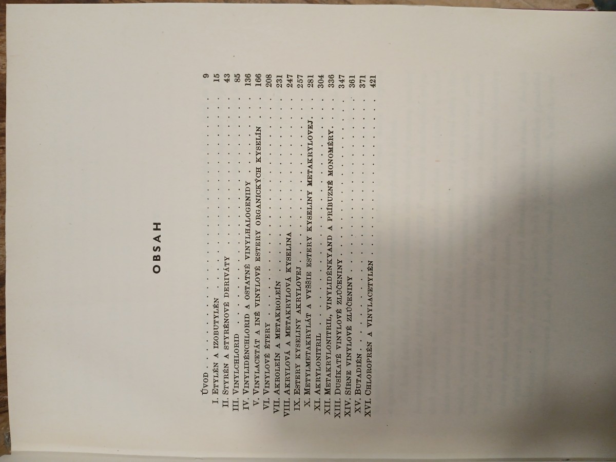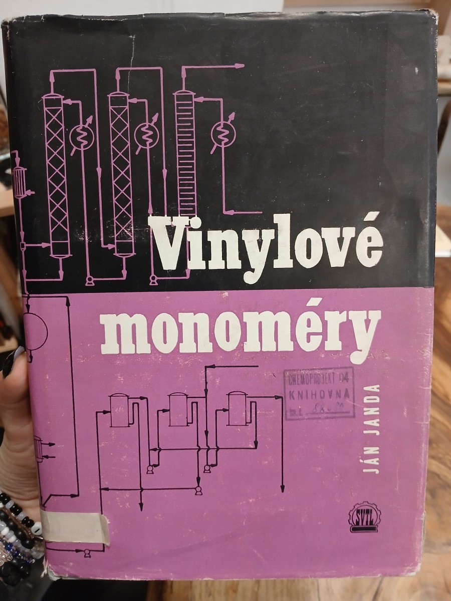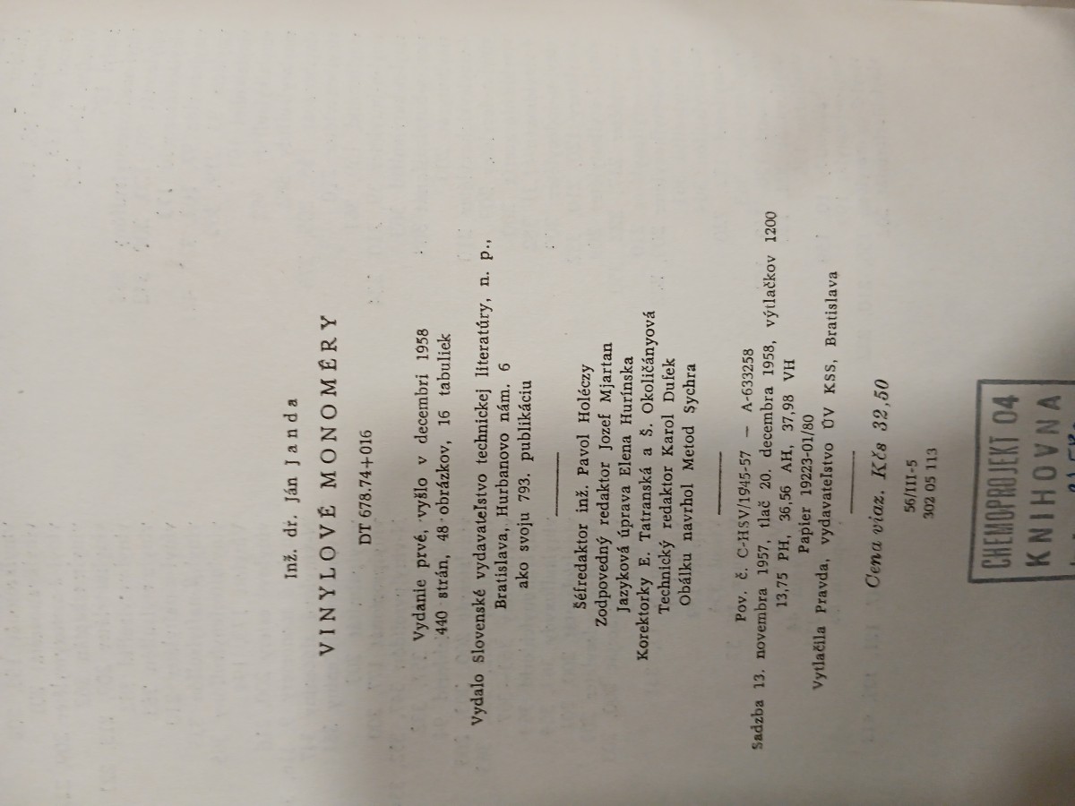 | Digitalizovaná tiráž: | Inž. dr. Ján Janda VINYLOVÉ MONOMERY DT 678.74+016 Vydanie prvé, vyšlo v decembri 1958 440 strán, 48 obrázkov, 16 tabuliek Vydalo Slovenské vydavateľstvo technickej literatúry, n. p., Bratislava, Hurbanovo nám. 6 ako svoju 793. publikáciu Šéfredaktor inž. Pavol Holéczy Zodpovedný redaktor Jozef Mjartan Jazyková úprava Elena Hurínska Korektorky E. Tatranská a š. Okoličányová Technický redaktor Karol Dufek Obálku navrhol Metod Sychra Pov. č. C-HSV/1945-57 - A-633258 Sadzba 13. novembra 1957, tlač 20. decembra 1958, výtlačkov 1200 13,75 PH, 36,56 AH, 37,98 VH Papier 19223-01/80 Vytlačila Pravda, vydavateľstvo OV KSS, Bratislava Cena viaz. Kčs 32,50 56/111-5 302 05 113 CHEMOPROJEKT 04 KNIHOVNA |