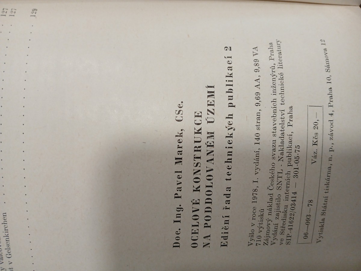 | Digitalizovaná tiráž: | 127 127 y valcon st v Gelsenkirchen 129 Doc. Ing. Pavel Marek, CSc. OCELOVÉ KONSTRUKCE NA PODDOLOVANÉM ÚZEMÍ Ediční řada technických publikací 2 Vyšlo v roce 1978, I. vydání, 140 stran, 9,69 AA, 9,89 VA 710 výtisků Zájmový náklad Českého svazu stavebních inženýrů, Praha Vydání zajistilo SNTL - Nakladatelství technické literatury ve Středisku interních publikací, Praha SIP-41622/03414 06-093-78 301-05-75 Váz. Kěs 20,- Vytiskla Státní tiskárna, n. p., závod 4, Praha 10, Sámova 12 |