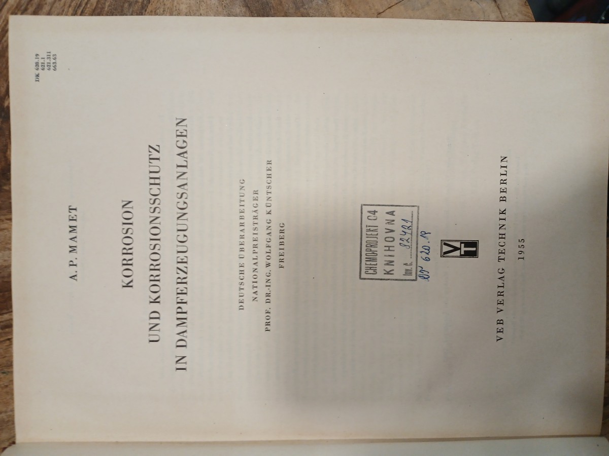 | Digitalizovaná tiráž: | A. P. MAMET KORROSION UND KORROSIONSSCHUTZ IN DAMPFERZEUGUNGSANLAGEN DEUTSCHE ÜBERARBEITUNG NATIONAL PREISTRÄGER PROF. DR.-ING. WOLFGANG KÜNTSCHER FREIBERG CHEMOPROJEKT C4 KNIHOVNA Inv. &.82421 07 620.19 V T VEB VERLAG TECHNIK BERLIN 1955 DK 620.19 621.1 621.311 663.63 |