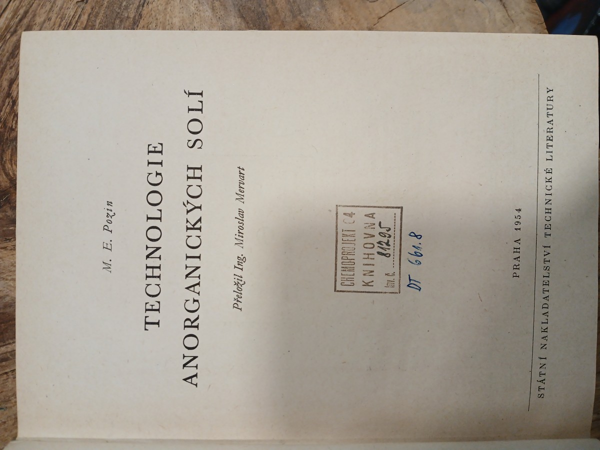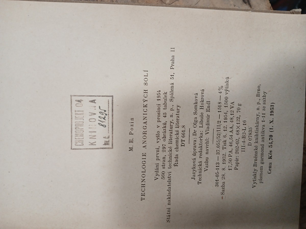 | Digitalizovaná tiráž: | CHEMOPROJEKT 04 KNIHOVNA Av. C. 81295 M. E. Pozin TECHNOLOGIE ANORGANICKÝCH SOLÍ Vydání první, vyšlo v prosinci 1954 560 stran, 297 obrázků, 45 tabulek Státní nakladatelství technické literatury, n. p., Spálená 51, Praha II Řada chemické literatury DT 661.8 Jazyková úprava: Dr Olga Somková Technická redaktorka: Libuše Hokrová Vazbu navrhl: Vladimír Endl. 301-05-113-37.055/52/III/2-1518-4% - Sazba 28. 8. 1952. Tisk 6. 12. 1954, 1500 výtisků 17,50 PA, 46,54 AA, 48,12 VA Papír: 202-02, 68X122, 70 g III-4-B2-L 16 D 07835' Vytiskly Brněnské knih tiskárny, n. p., Brno, písmem garmond antikva 1-11 ze sazby Cena Kes 54,70 (1. X. 1953) |