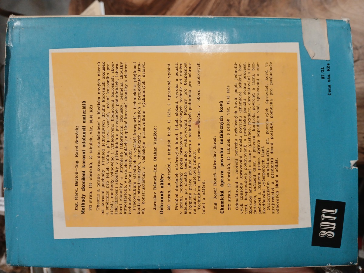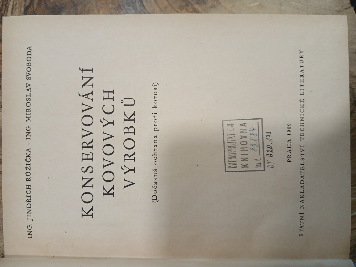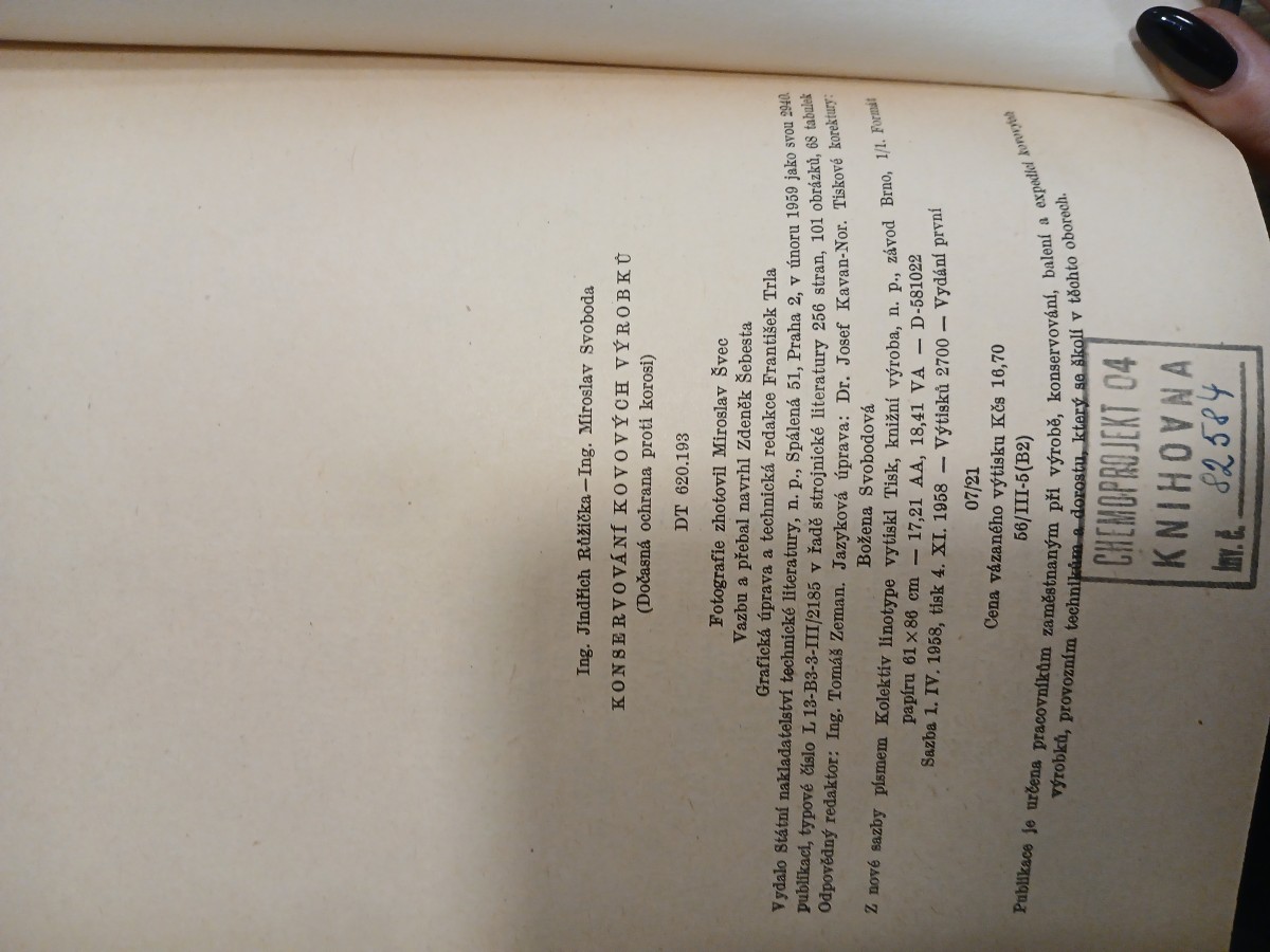 | Digitalizovaná tiráž: | Ing. Jindřich Růžička-Ing. Miroslav Svoboda KONSERVOVÁNÍ KOVOVÝCH VÝROBKŮ (Dočasná ochrana proti korosi) DT 620.193 Fotografie zhotovil Miroslav Švec Vazbu a přebal navrhl Zdeněk Šebesta Grafická úprava a technická redakce František Trla Vydalo Státní nakladatelství technické literatury, n. p., Spálená 51, Praha 2, v únoru 1959 jako svou 294 publikaci, typové číslo L 13-B3-3-III/2185 v řadě strojnické literatury 256 stran, 101 obrázků, 68 tabulk Odpovědný redaktor: Ing. Tomáš Zeman. Jazyková úprava: Dr. Josef Kavan-Nor. Tiskové korektury: Božena Svobodová Z nové sazby písmem Kolektiv linotype vytiskl Tisk, knižní výroba, n. p., závod Brno, 1/1. Formát papíru 61 x86 cm - 17,21 AA, 18,41 VA - D-581022 Sazba 1. IV. 1958, tisk 4. XI. 1958 - výtisků 2700 - Vydání první 07/21 Cena vázaného výtisku Kčs 16,70 56/III-5(B2) Publikace je určena pracovníkům zaměstnaným při výrobě, konservování, balení a expodiel korovy výrobků, provozním technikám a dorostu, který se školí v těchto oborech. CHEMOPROJEKT 04 KNIHOVNA 82584 |