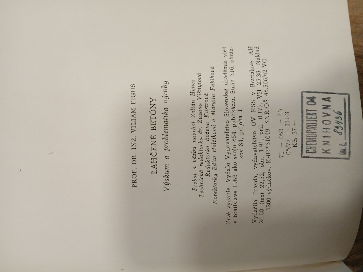 | Digitalizovaná tiráž: | PROF. DR. INZ. VILIAM FIGUŠ ĽAHČENÉ BETÓNY Výskum a problematika výroby Prebal a väzbu navrhol Zoltán Hencz Technická redaktorka dr. Zuzana Višnyiová Redaktorka Božena Kustrová Korektorky Edita Holčíková a Margita Fabíková Prvé vydanie. Vydalo Vydavateľstvo Slovenskej akadémie vied v Bratislave 1963 ako svoju 854. publikáciu. Strán 316, obráz- kov 84, príloha 1 Vytlačila Pravda, vydavateľstvo ÚV KSS v Bratislave. AH 24,60 (text 22,52, obr. 1,91, príl. 0,17), VH 25,38. Náklad 1200 výtlačkov. K-03*31049. SNR-OŠ 48.566/62-VO 71053 - 63 05/77 III-3 Kčs 37,- CHEMOPROJEKT 04 KNIHOVNA 83436 Low... |