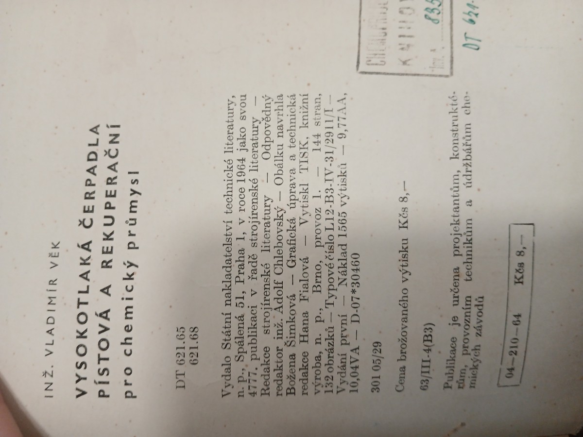 Vysokotlaká čerpadla pístová a rekuperační pro chemický průmysl : Určeno projektantům, konstruktérům, provoz. technikům a údržbářům chem. závodů, 1964