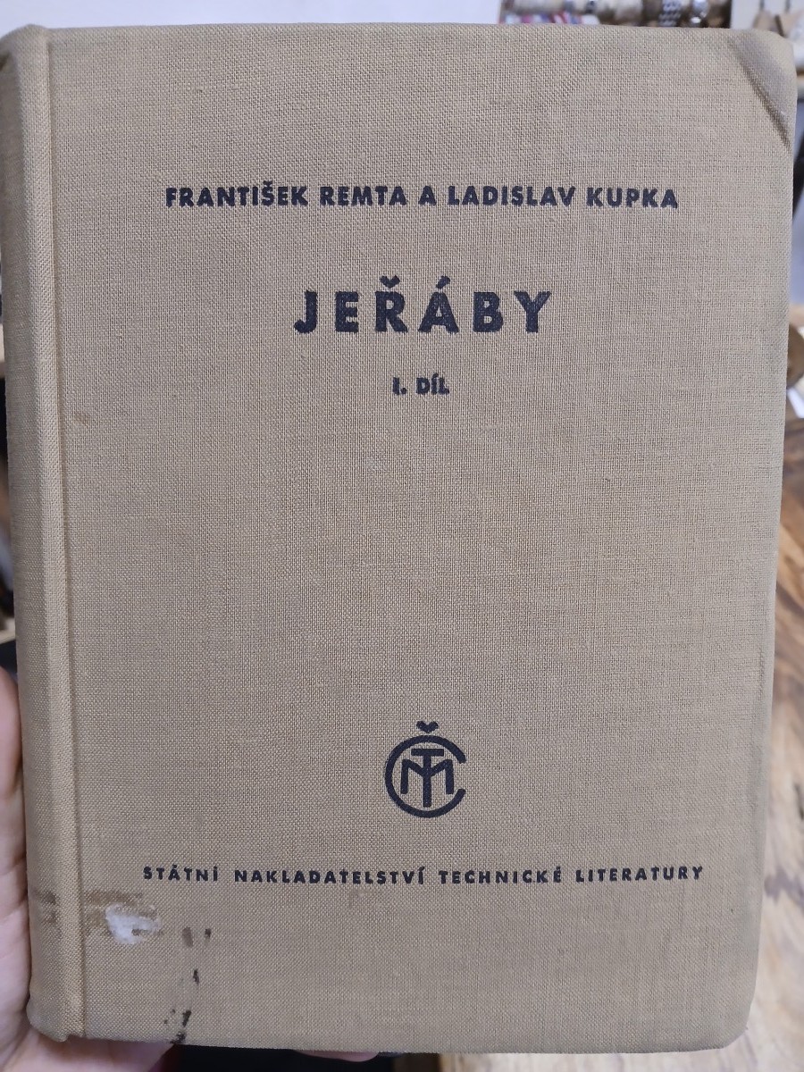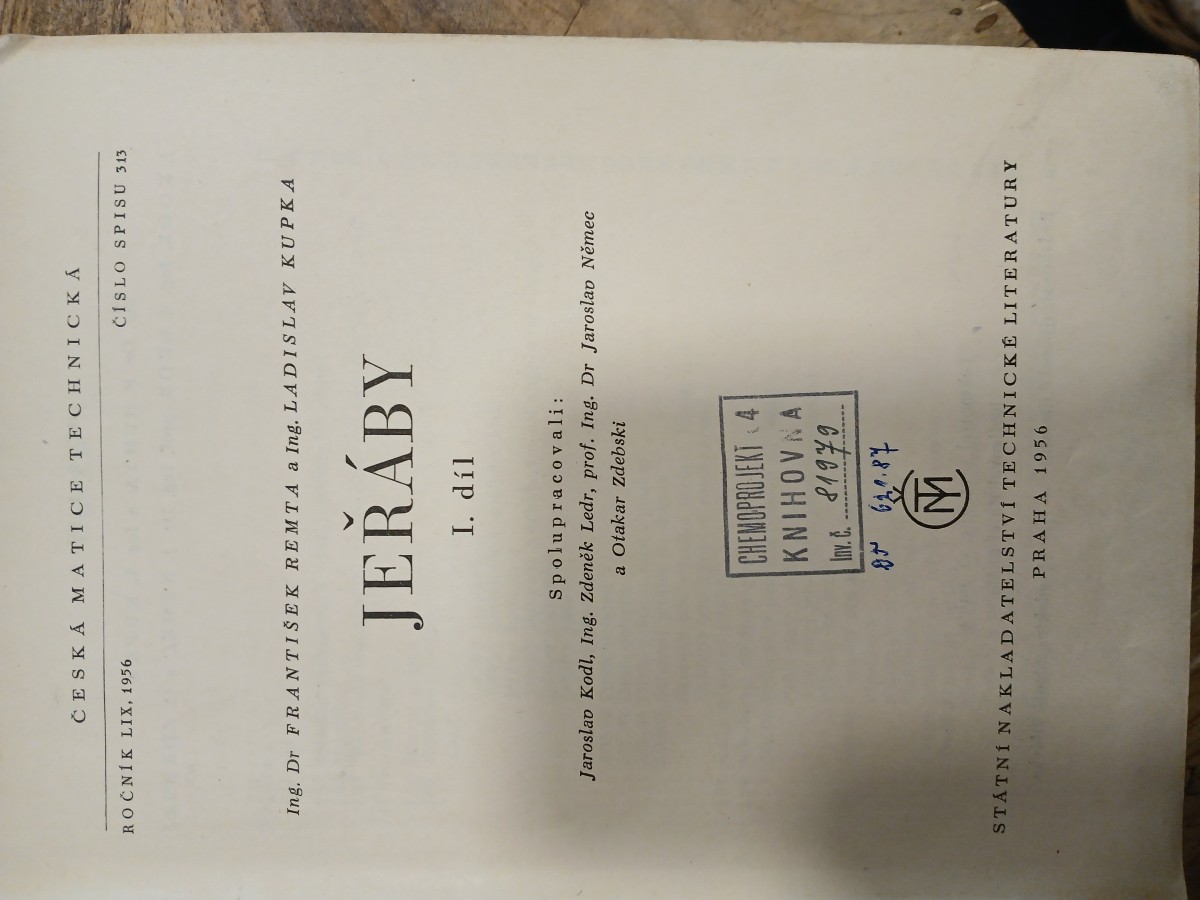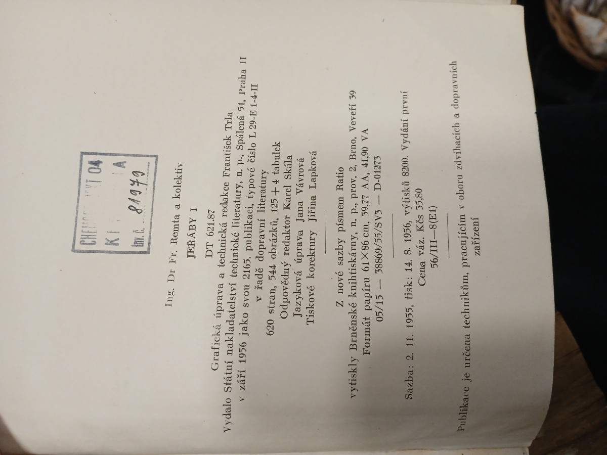 | Digitalizovaná tiráž: | CHEMT 04 KI A Inv. č. 81979 Ing. Dr Fr. Remta a kolektiv JEŘÁBY I DT 621.87 Grafická úprava a technická redakce František Trla Vydalo Státní nakladatelství technické literatury, n. p., Spálená 51, Praha II v září 1956 jako svou 2165. publikaci, typové číslo L 29-E 1-4-II v řadě dopravní literatury 620 stran, 544 obrázků, 125 +4 tabulek Odpovědný redaktor Karel Skála Jazyková úprava Jana Vávrová Tiskové korektury Jiřina Lapková Z nové sazby písmem Ratio vytiskly Brněnské knihtiskárny, n. p., prov. 2, Brno, Veveří 39 Formát papíru 61X86 cm, 39,77 AA, 41,90 VA 05/15 - 38869/55/SV3 - D-01273 Sazba: 2. 11. 1955, tisk: 14. 8. 1956, výtisků 8200. Vydání první Cena váz. Kčs 35,80 56/III-8(E1) Publikace je určena technikům, pracujícím v oboru zdvíhacích a dopravních zařízení |