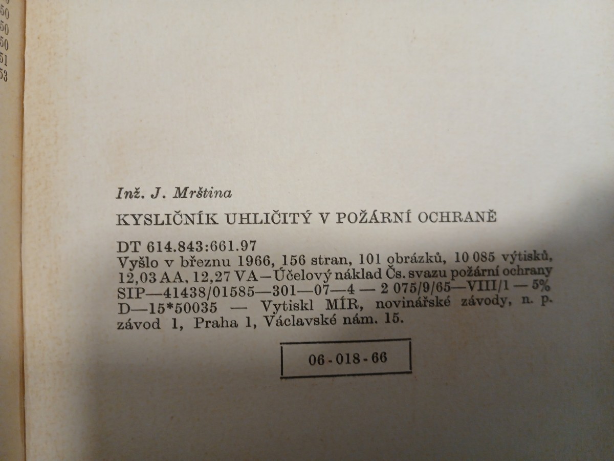 | Digitalizovaná tiráž: | 50 51 53 Inž. J. Mrština KYSLIČNÍK UHLIČITÝ V POŽÁRNÍ OCHRANĚ DT 614.843:661.97 Vyšlo v březnu 1966, 156 stran, 101 obrázků, 10 085 výtisků, 12,03 AA, 12,27 VA-Účelový náklad Čs. svazu požární ochrany SIP-41438/01585-301-07-4 2 075/9/65-VIII/1-5% Vytiskl MÍR, novinářské závody, n. p. D-15*50035 - závod 1, Praha 1, Václavské nám. 15. 06-018-66 |