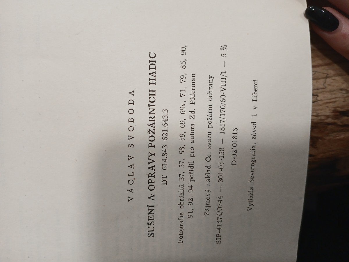 | Digitalizovaná tiráž: | VÁCLAV SVOBODA SUŠENÍ A OPRAVY POŽÁRNÍCH HADIC DT 614.843 621.643.3 Fotografie obrázků 37, 57, 58, 59, 69, 69a, 71, 79, 85, 90, 91, 92, 94 pořídil pro autora Zd. Piderman Zájmový náklad Čs. svazu požární ochrany SIP-41474/0744 301-05-158 1857/170/60-VIII/1 - 5% D-02*01816 Vytiskla Severografia, závod 1 v Liberci |