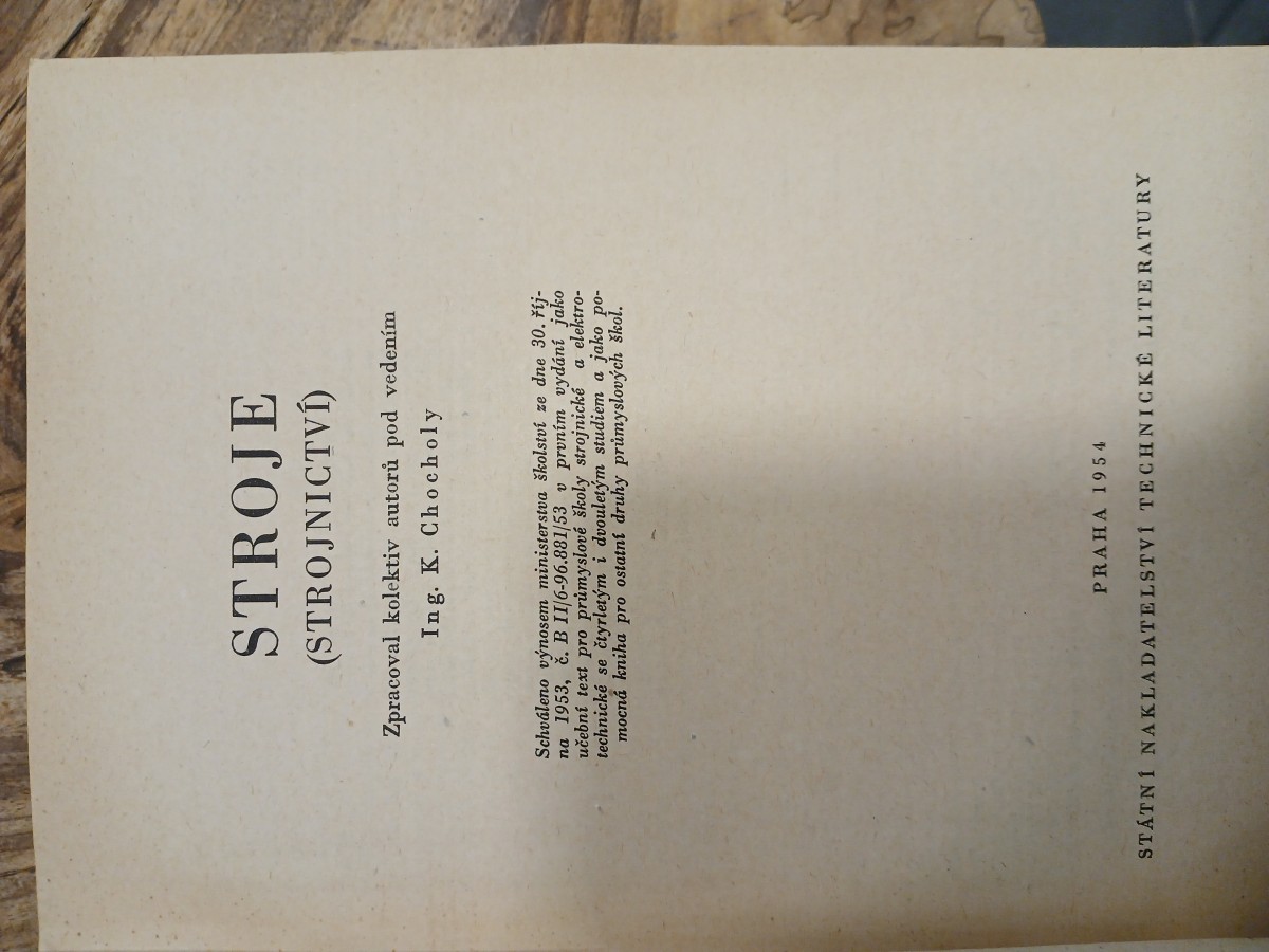 | Digitalizovaná tiráž: | STROJE (STROJNICTVÍ) Zpracoval kolektiv pod vedením Ing. K. Chocholy Vydání první, vyšlo v listopadu 1954, 676 stran, 776 obrázků Vydalo Státní nakladatelství technické literatury, n. p., Spálená 51, Praha II Řada strojírenské literatury DT 621.002.2 Jazyková úprava: Dr Arnoštka Kubelková Tiskové korektury: Edita Tibitanzlová Technický redaktor: Jiří Appl Vazbu navrhl: F. J. Müller 301 05-13 2233/1/53 - 1393 Sazba 16. 12. 1953. Tisk 1. 10. 1954. - 4% 30 700 výtisků 24,25 PA, 51,68 AA, 53,08 VA Papír: 222-02, 86×122, 70 g III-3-C2-L13 D-00784 Vytiskly Brněnské knihtiskárny, n. p., Brno ze sazby Cena Kčs 44,60 (1. 10. 1953) |