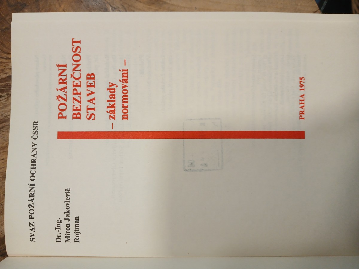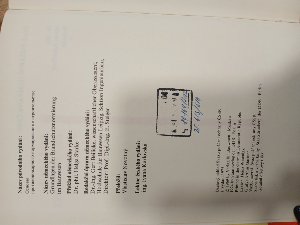 | Digitalizovaná tiráž: | Název původního vydání: Основы противопожарного нормирования в строительстве Název německého vydání: Grundlagen der Brandschutznormierung im Bauwesen Překlad německého vydání: Dr. phil. Helga Starke Redakční úprava německého vydání: Dr.-Ing. Gert Beilicke, wissenschaftlicher Oberassistent, Hochschule für Bauwesen Leipzig, Sektion Ingenieurbau, Direktor: Prof. Dipl.-Ing. E. Steiger Přeložil: Vlastislav Novotný Lektor českého vydání: ing. Ivana Karlovská 04 10169/3m DT: 613/614 Účelový náklad Svazu požární ochrany ČSSR 1. vydání 1975 1969 by Verlag für Bauwesen Moskau 1974 by Staatsverlag der DDR Berlin Printed in the German Democratic Republic Lektor: Heinz Wesenigk Grafy: Arthur Gártner Vazbu navrhl: Svaz požární ochrany ČSSR Sazba tisk a vazba knihy: Staatsdruckerei der DDR Berlin (rotační ofsetový tisk) |