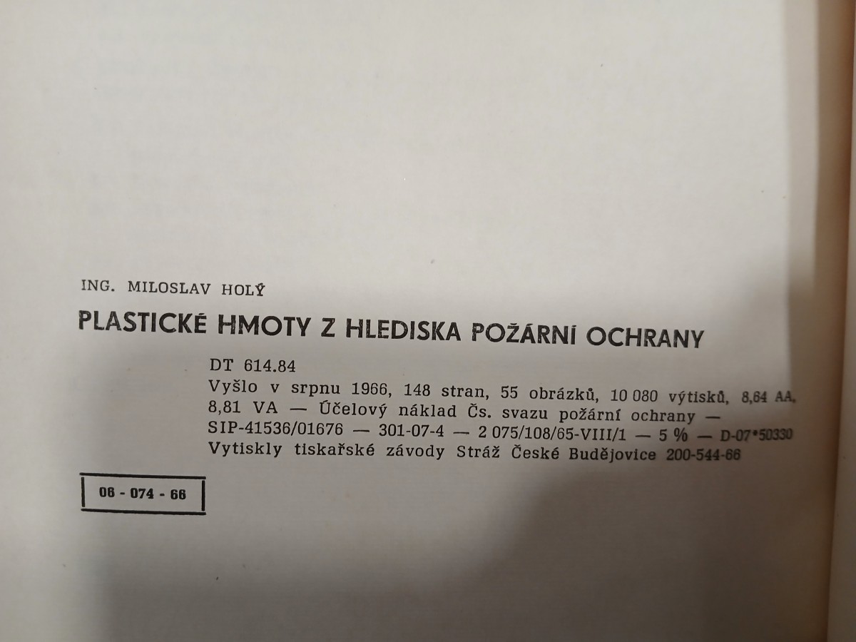 | Digitalizovaná tiráž: | ING. MILOSLAV HOLY PLASTICKÉ HMOTY Z HLEDISKA POŽÁRNÍ OCHRANY 06-074-66 DT 614.84 Vyšlo v srpnu 1966, 148 stran, 55 obrázků, 10 080 výtisků, 8,64 AA, 8,81 VA - Účelový náklad Čs. svazu požární ochrany SIP-41536/01676 -301-07-4-2 075/108/65-VIII/1 <- 5%-D-07*50330 Vytiskly tiskařské závody Stráž České Budějovice 200-544-66 |