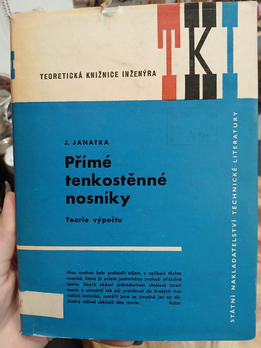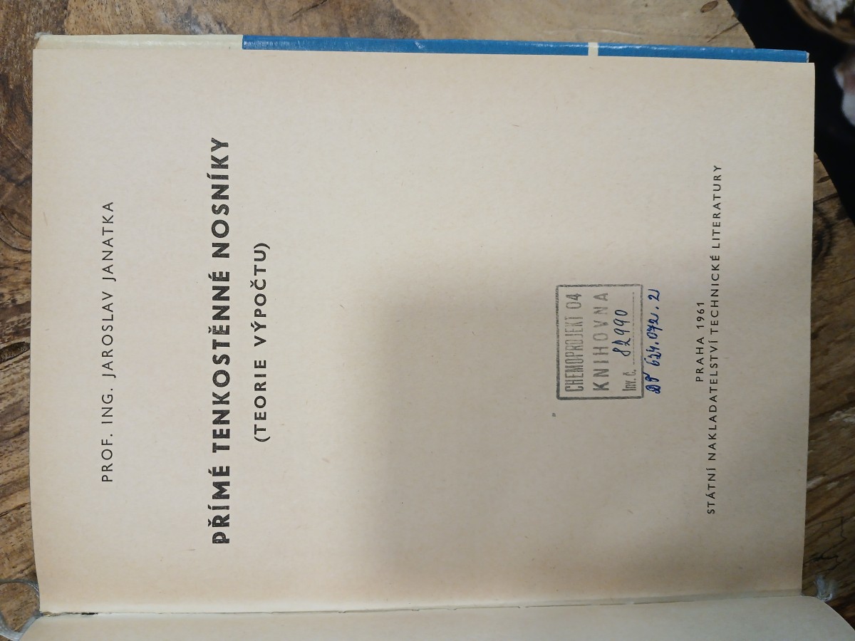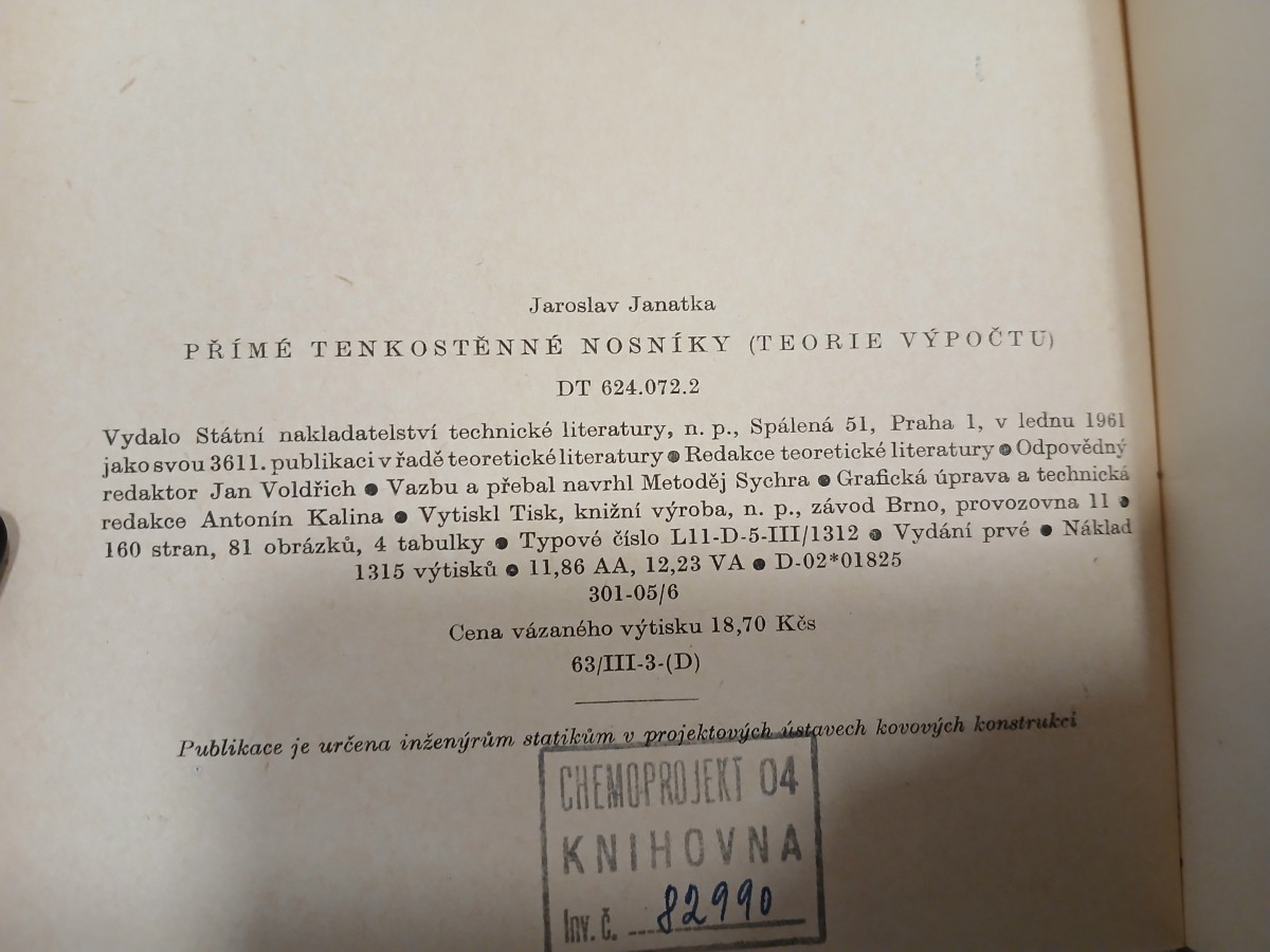 | Digitalizovaná tiráž: | Jaroslav Janatka PŘÍMÉ TENKOSTĚNNÉ NOSNÍKY (TEORIE VÝPOČTU) DT 624.072.2 Vydalo Státní nakladatelství technické literatury, n. p., Spálená 51, Praha 1, v lednu 1961 jako svou 3611. publikaci v řadě teoretické literatury Redakce teoretické literatury. Odpovědný redaktor Jan Voldřich Vazbu a přebal navrhl Metoděj Sychra Grafická úprava a technická redakce Antonín Kalina Vytiskl Tisk, knižní výroba, n. p., závod Brno, provozovna 11 ə 160 stran, 81 obrázků, 4 tabulky Typové číslo L11-D-5-III/1312 Vydání prvé Náklad 11,86 AA, 12,23 VAD-02*01825 301-05/6 1315 výtisků Cena vázaného výtisku 18,70 Kčs 63/III-3-(D) Publikace je určena inženýrům statikům v projektových ústavech kovových konstrukci CHEMOPROJEKT 04 KNIHOVNA Av. C. 82990 Č. |